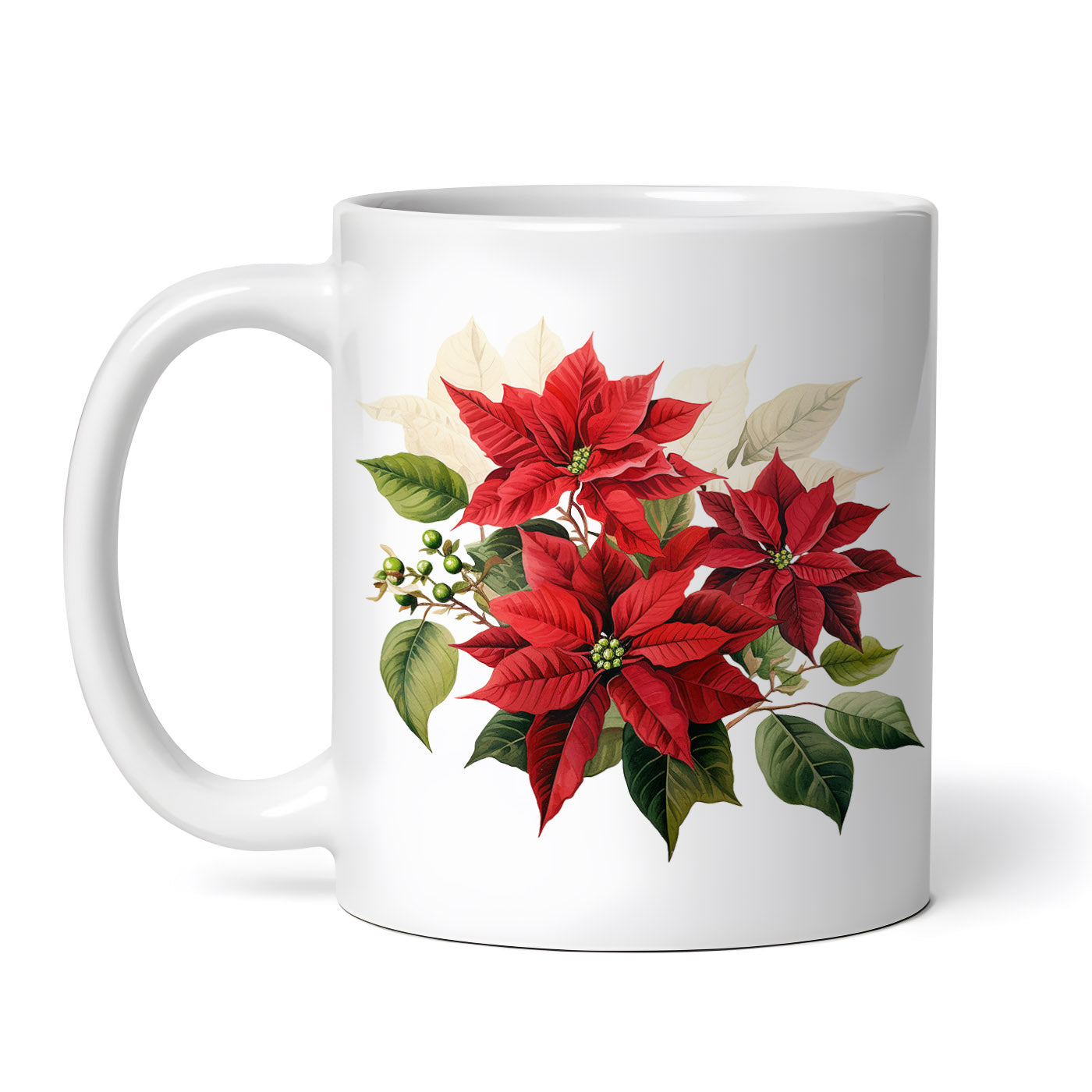 Cana ceramica, Flori de craciun rosii cu frunze albe, NO4660, 330 ml, Multicolor