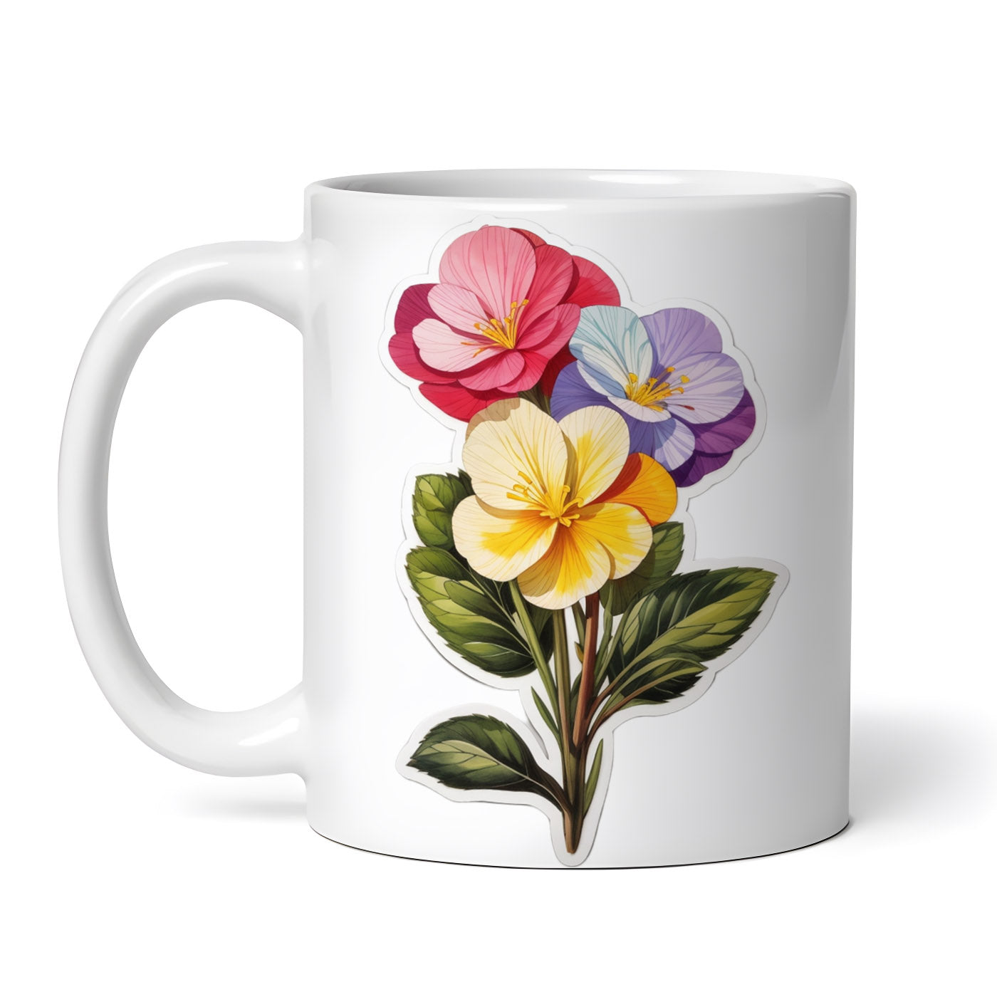 Cana ceramica, Flori de primula cu frunze, NO8772, 330 ml, Multicolor
