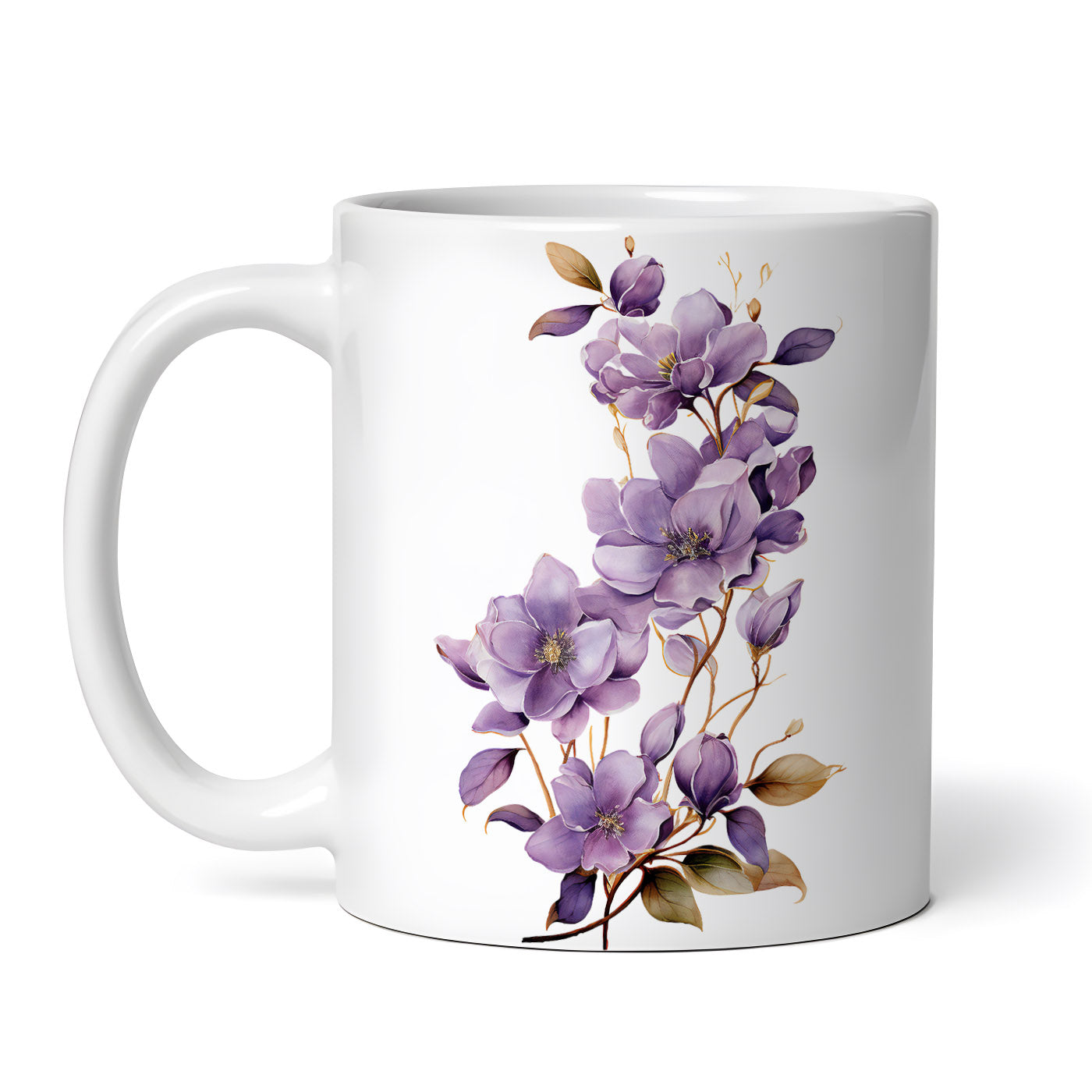 Cana ceramica, Flori mov cu frunze maro, NO2302, 330 ml, Multicolor