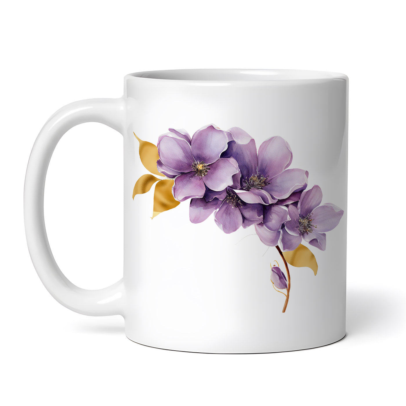 Cana ceramica, Ghirlanda cu flori mov si frunze aurii, NO2846, 330 ml, Multicolor