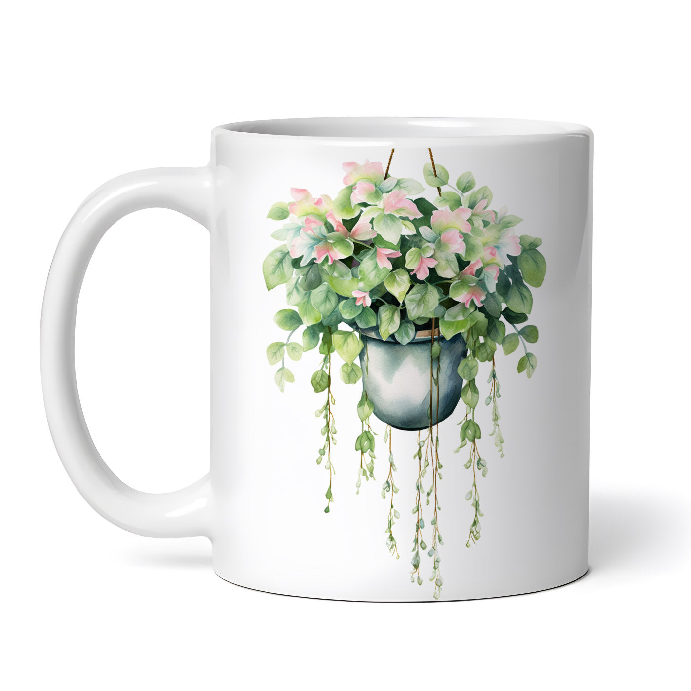 Cana ceramica, Ghiveci suspendat cu flori roz cu frunze verzi, NO4442, 330 ml, Multicolor
