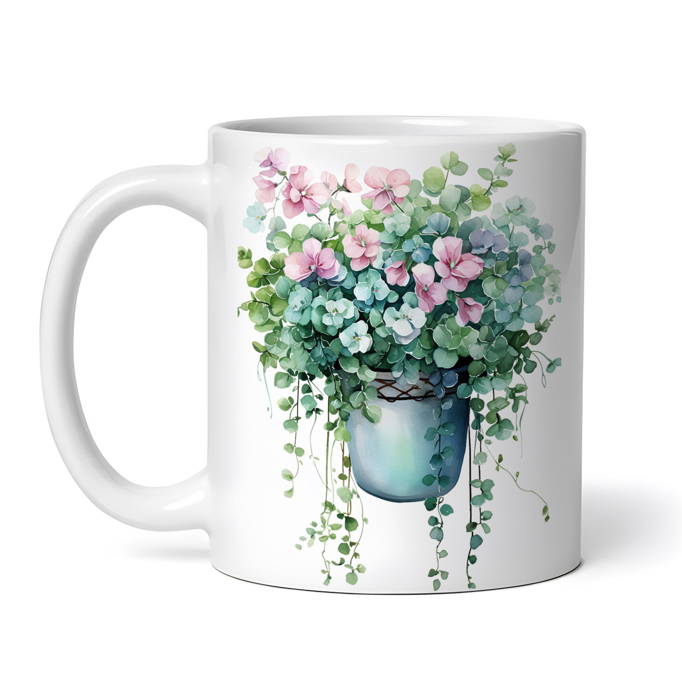 Cana ceramica, Ghiveci suspendat cu flori roz si verzi, NO396, 330 ml, Multicolor