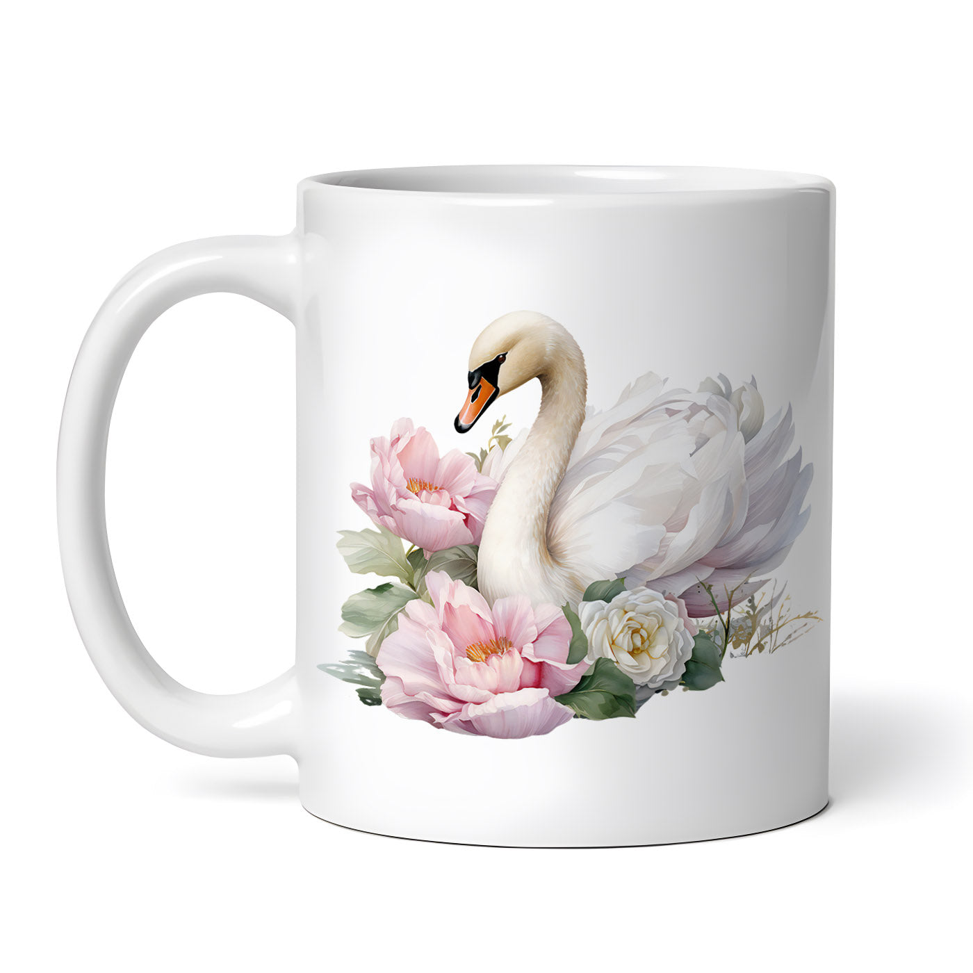 Cana ceramica, Lebeda alba cu flori roz si alb, NO3444, 330 ml, Multicolor