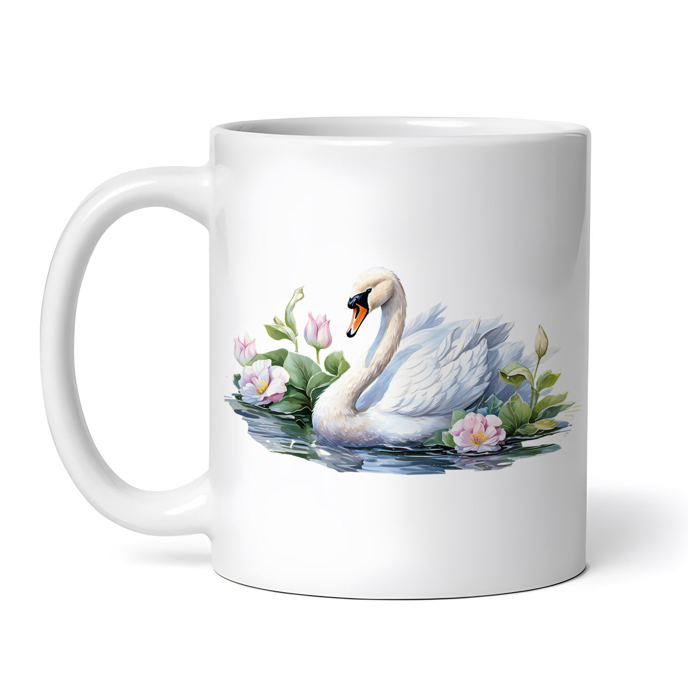 Cana ceramica, Lebeda alba pe lac cu flori roz, NO5231, 330 ml, Multicolor
