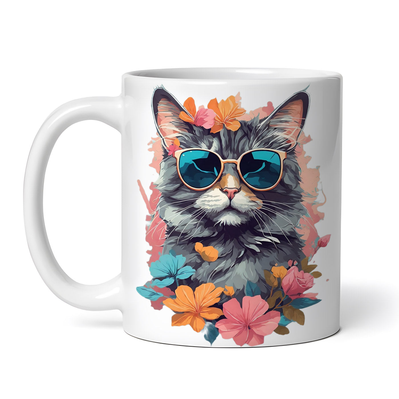Cana ceramica, Pisica cu flori in par, NO6648, 330 ml, Multicolor