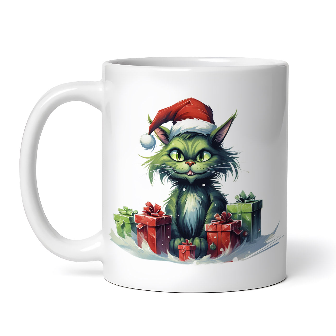 Cana ceramica, Pisica Grinch asezata intre cadouri, NO1779, 330 ml, Multicolor