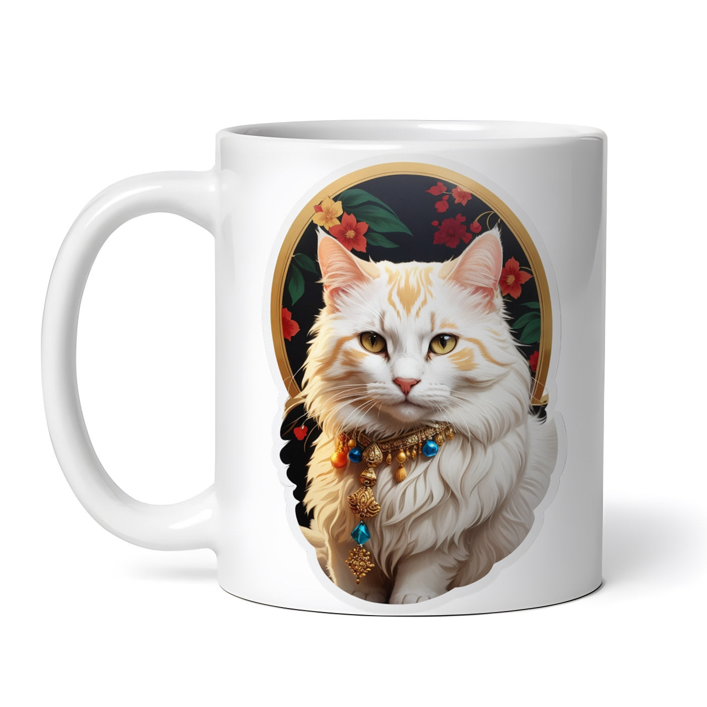 Cana ceramica, Pisica Khao manee cu colier, NO8398, 330 ml, Multicolor
