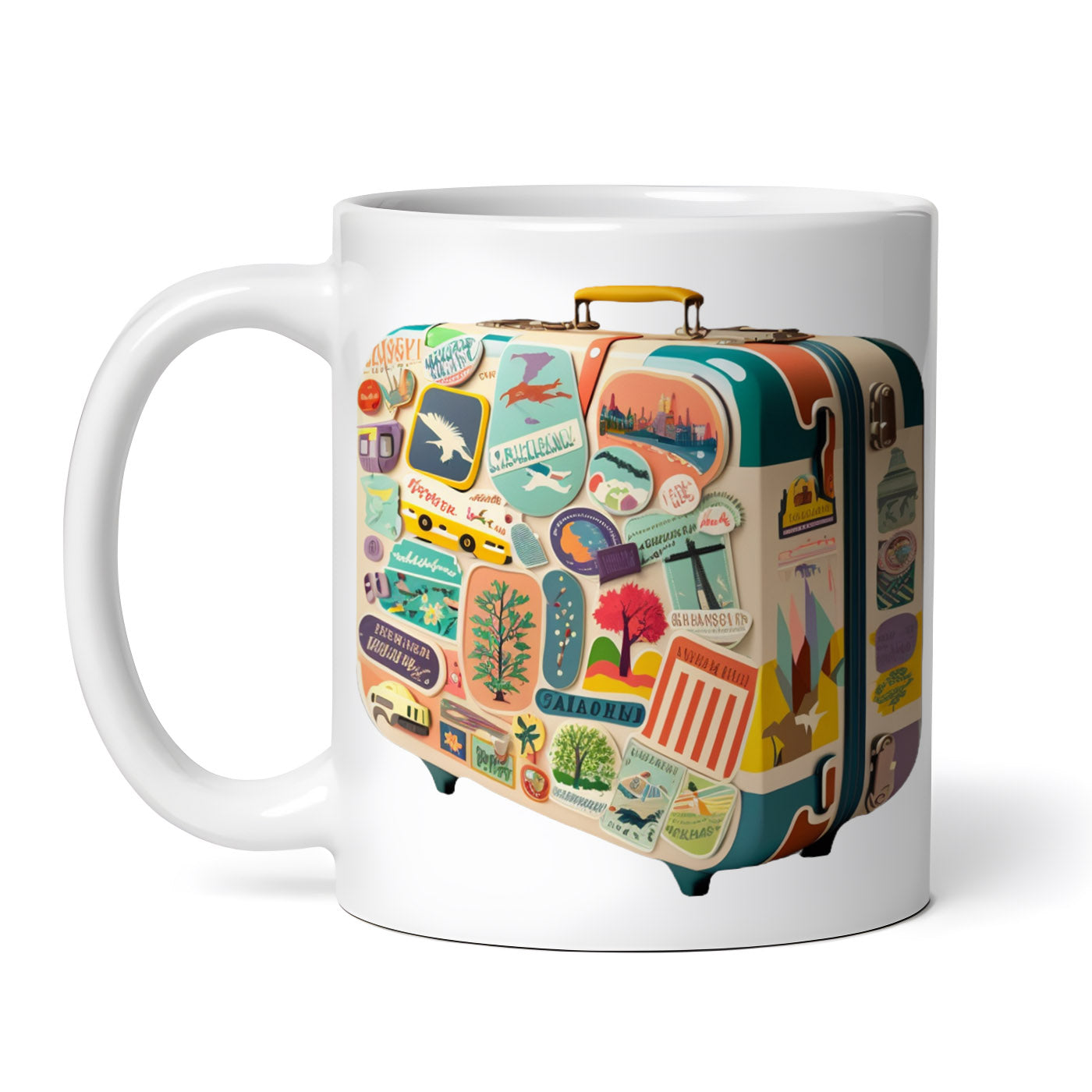 Cana ceramica, Valiza tapetata cu timbre, NO7634, 330 ml, Multicolor