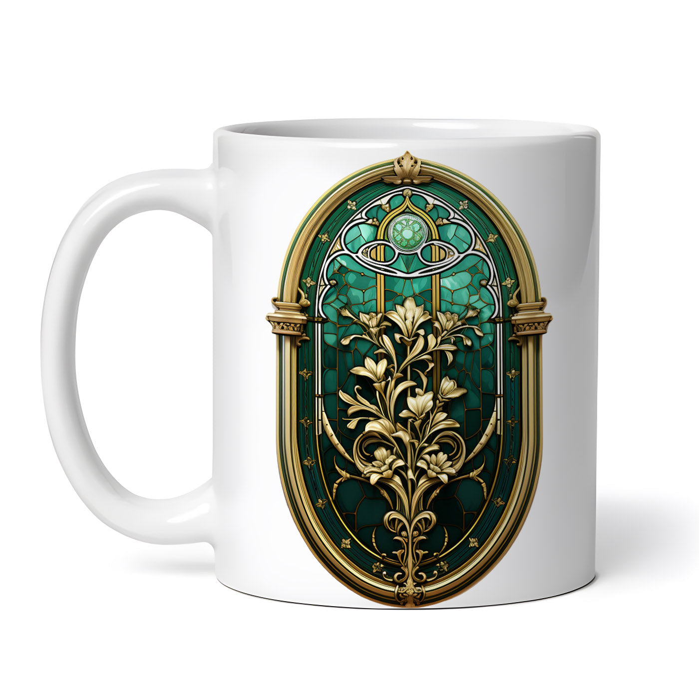 Cana ceramica, Vitralii de esmerald cu flori aurite, NO1881, 330 ml, Multicolor