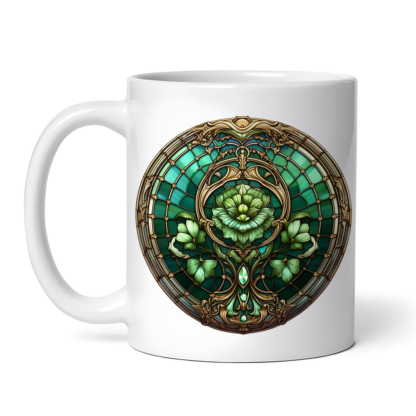 Cana ceramica, Vitralii de esmerald cu flori, NO422, 330 ml, Multicolor