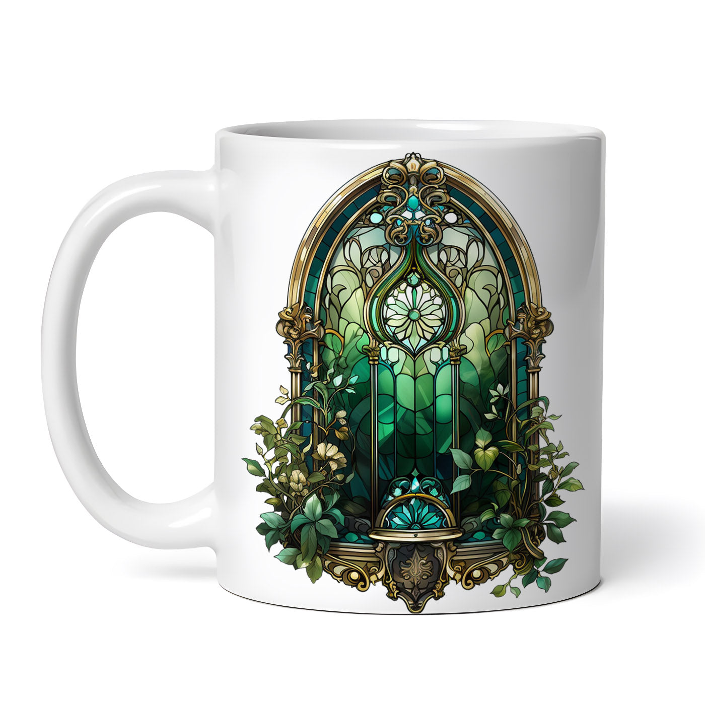 Cana ceramica, Vitralii de esmerald cu frunze si flori, NO4601, 330 ml, Multicolor