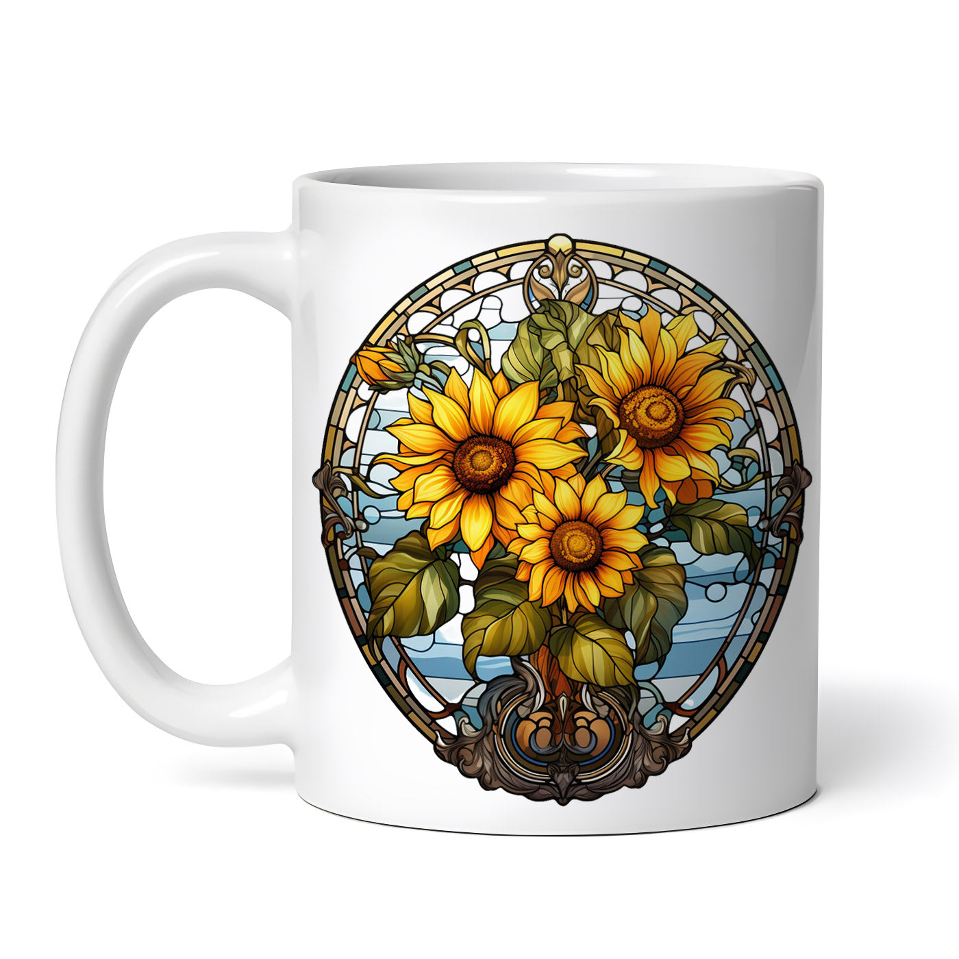 Cana ceramica, Vitraliu albastru oval floarea soarelui, NO6054, 330 ml, Multicolor