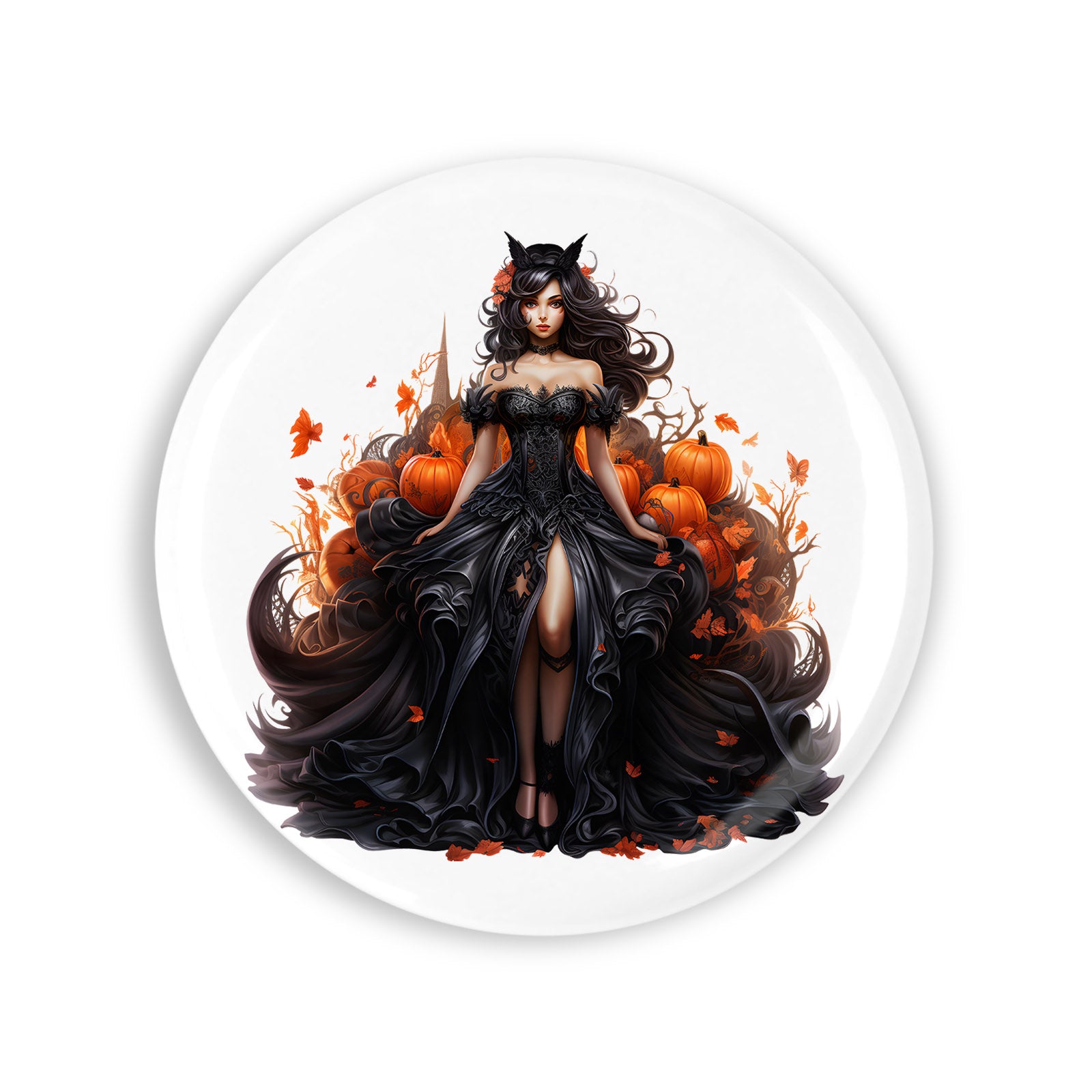 Set 4 insigne, Halloween Vrajitoarea intunericului cu dovleci, NO4230, Metal, 44 mm, Multicolor