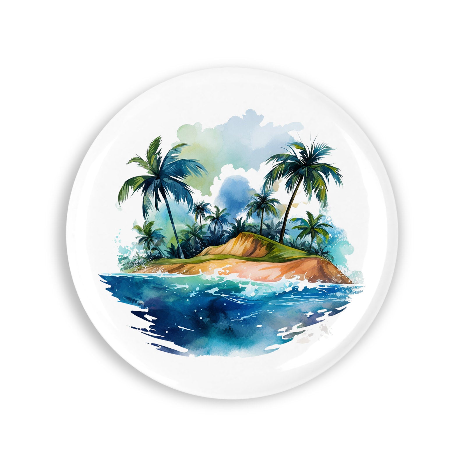 Set 4 insigne, Insula tropicala cu dealuri si palmieri, NO5484, Metal, 44 mm, Multicolor