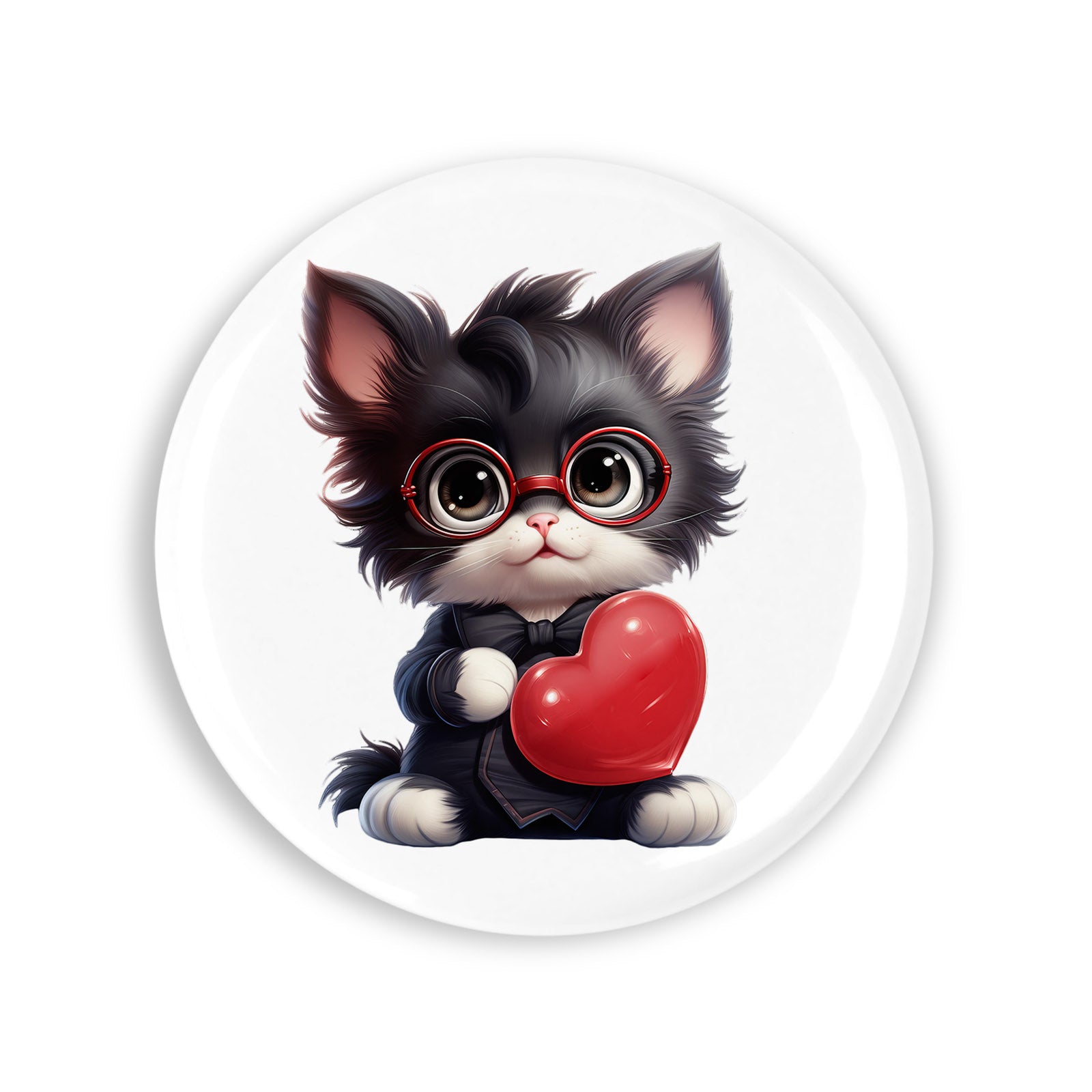 Set 4 insigne, Sfantul Valentin Pisica neagra cu inimioara si ochelari, NO2768, Metal, 44 mm, Multicolor