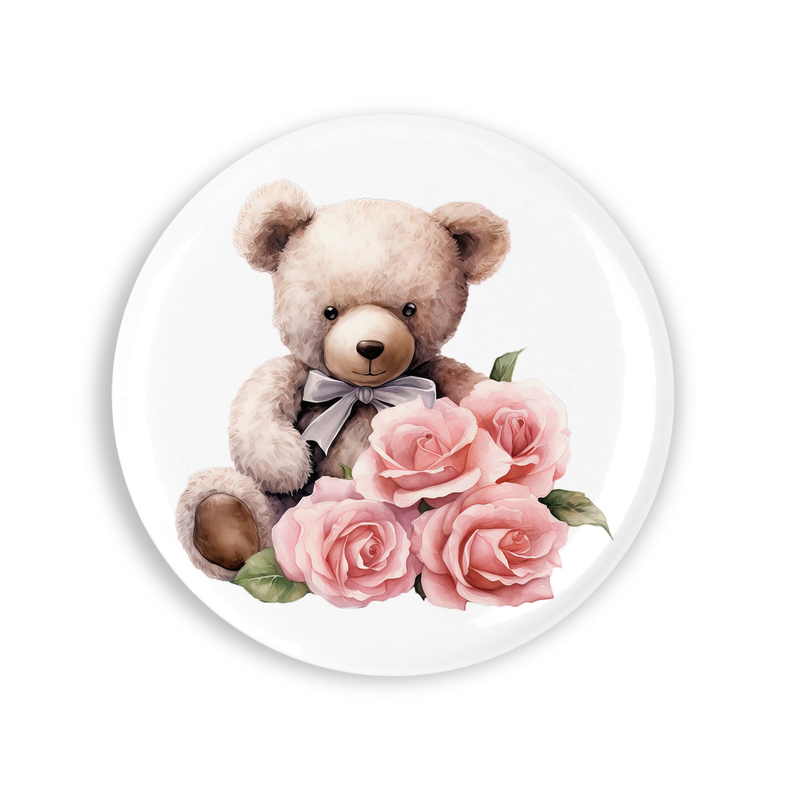 Set 4 insigne, Sfantul Valentin Urs cu trandafiri roz, NO2837, Metal, 44 mm, Multicolor