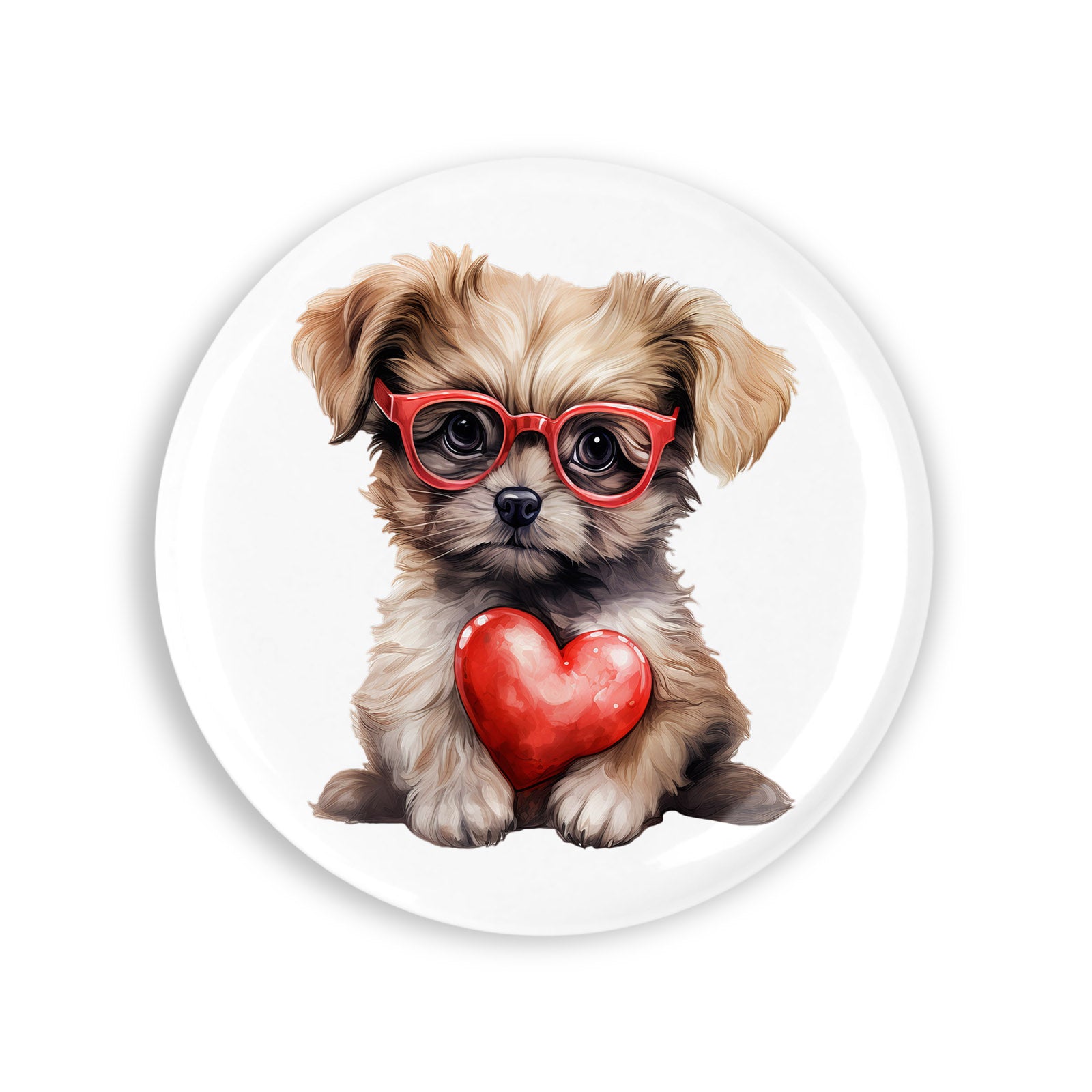 Set 4 insigne, Shih Tzu cu ochelari si inima rosie, NO4732, Metal, 44 mm, Multicolor