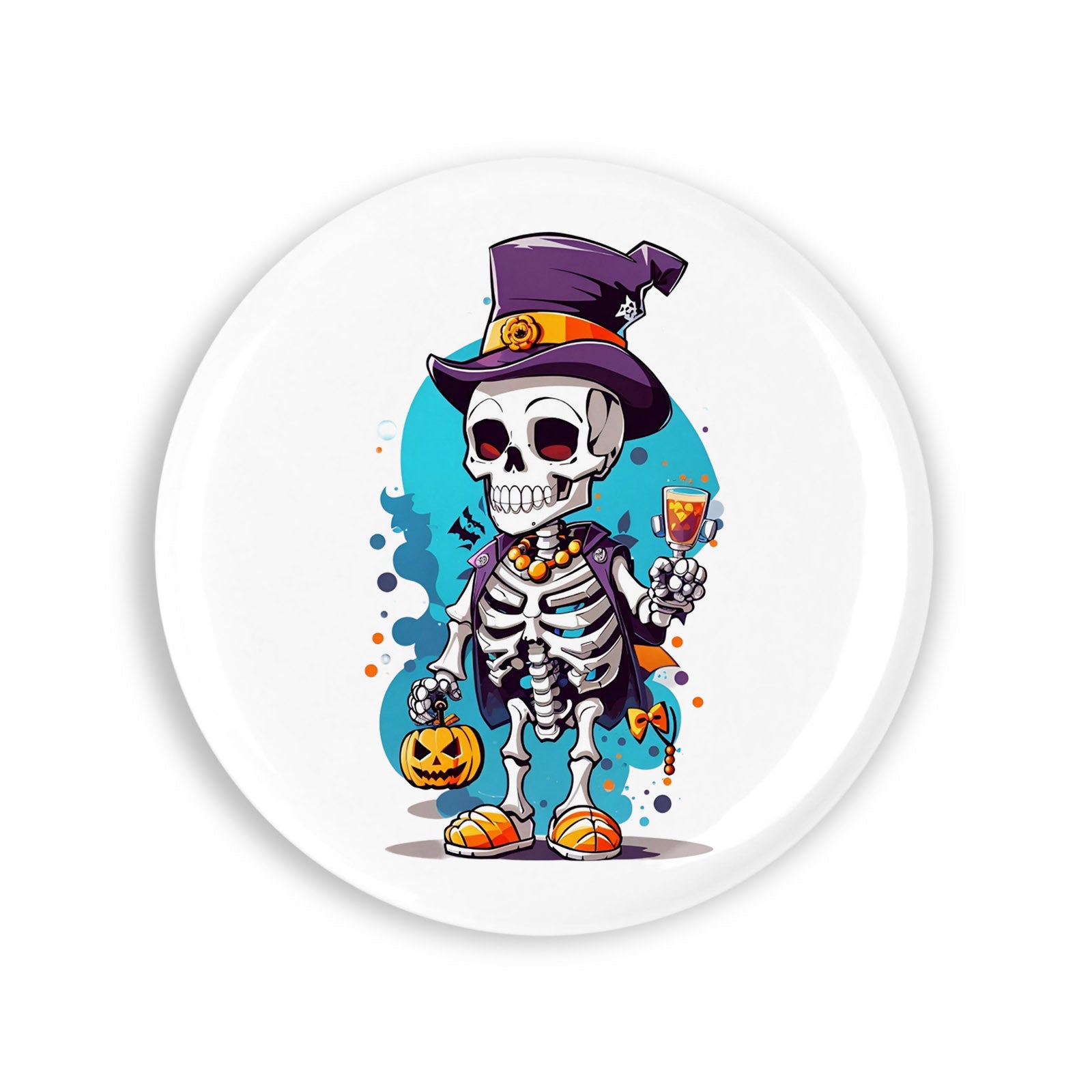 Set 4 insigne, Skeleton cu papuci si joben de halloween, NO6991, Metal, 44 mm, Multicolor
