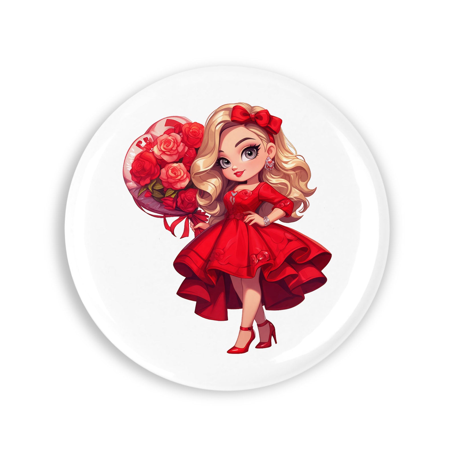 Set 4 insigne, Valentine Girl Fata cu buchet de flori, NO4366, Metal, 44 mm, Multicolor