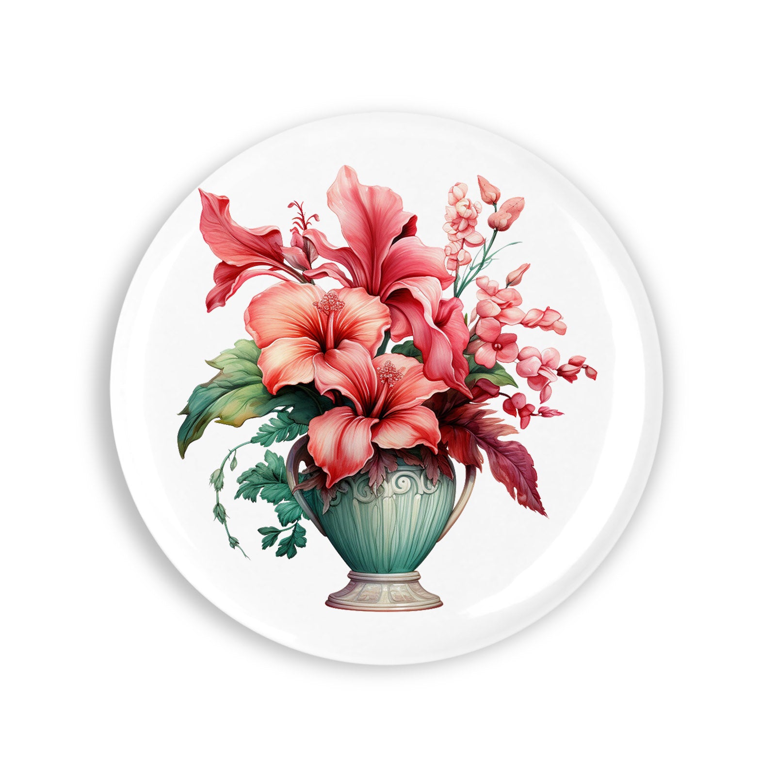 Set 4 insigne, Vaza albastra cu hibiscus rosu, NO4803, Metal, 44 mm, Multicolor