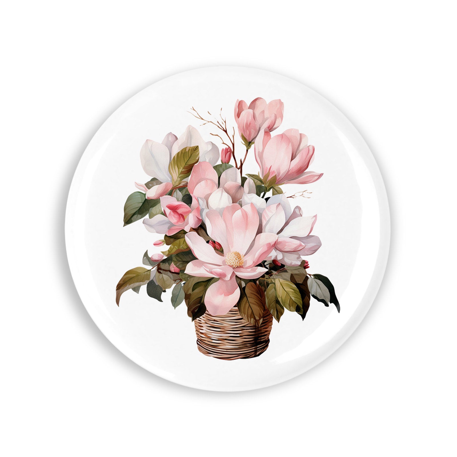 - Set 4 insigne, Cos de nuiele rotund cu magnolii, NO192, Metal, 44 mm, Multicolor