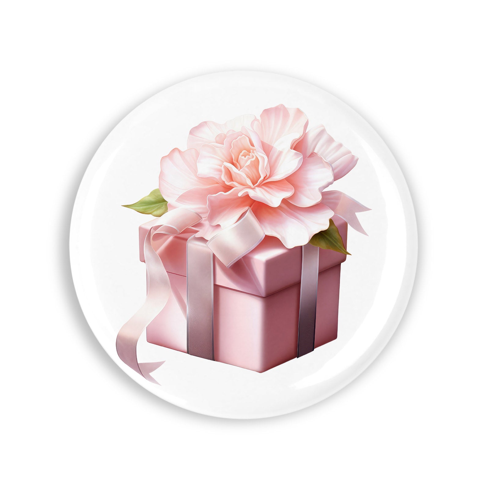 - Set 4 insigne, Cutie de cadou roz cu floare si funda, NO4674, Metal, 44 mm, Multicolor