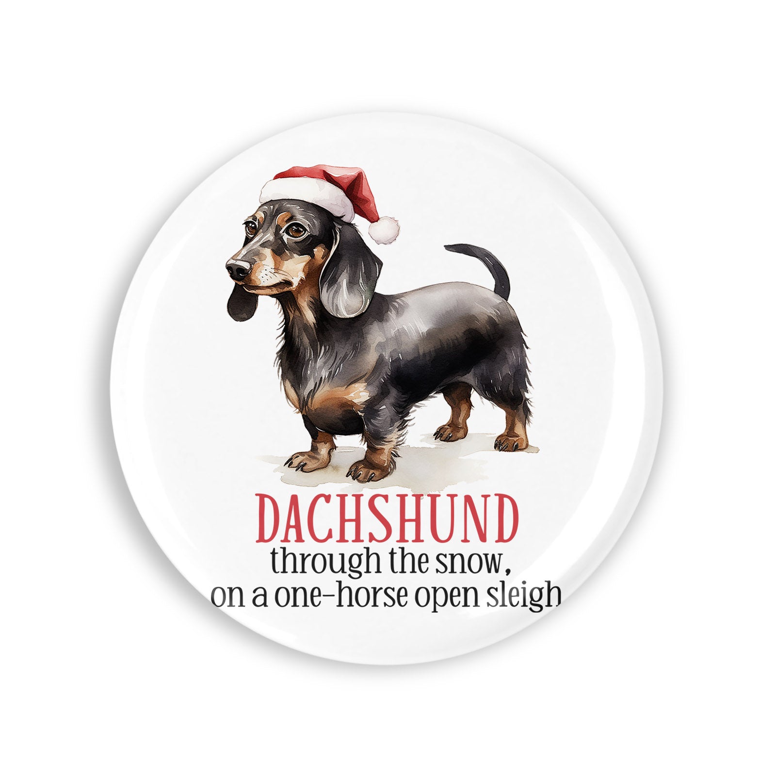 - Set 4 insigne, Dachshund Trough the snow on a one horse open sleigh, NO5219, Metal, 44 mm, Multicolor
