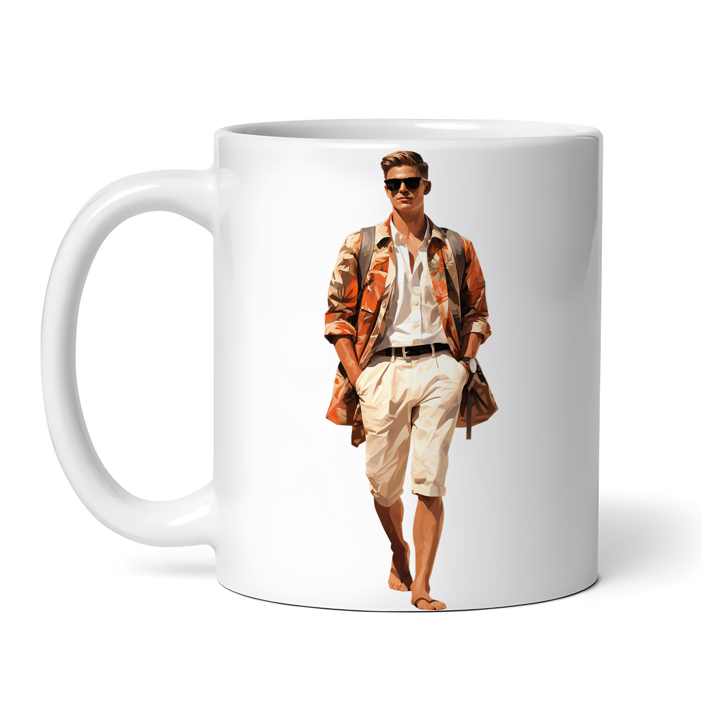 - Cana ceramica, Barbat cu pantaloni scurti bej si jacheta florala maro, NO302, 330 ml, Multicolor