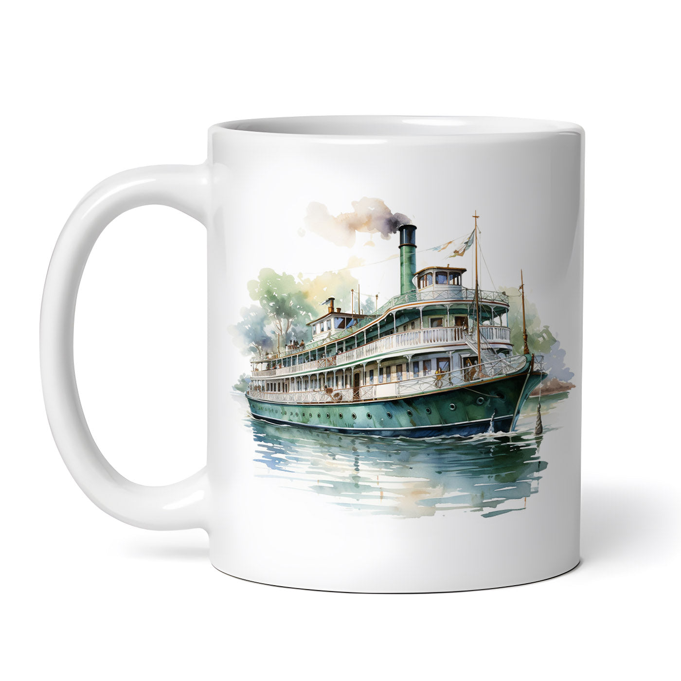 - Cana ceramica, Barca fluviala cu aburi alb cu verde, NO3620, 330 ml, Multicolor