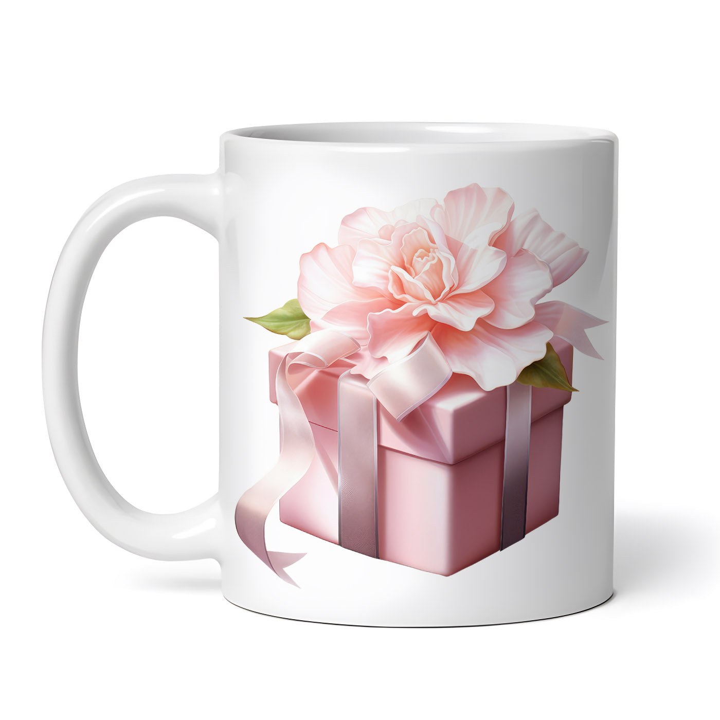 - Cana ceramica, Cutie de cadou roz cu floare si funda, NO4674, 330 ml, Multicolor