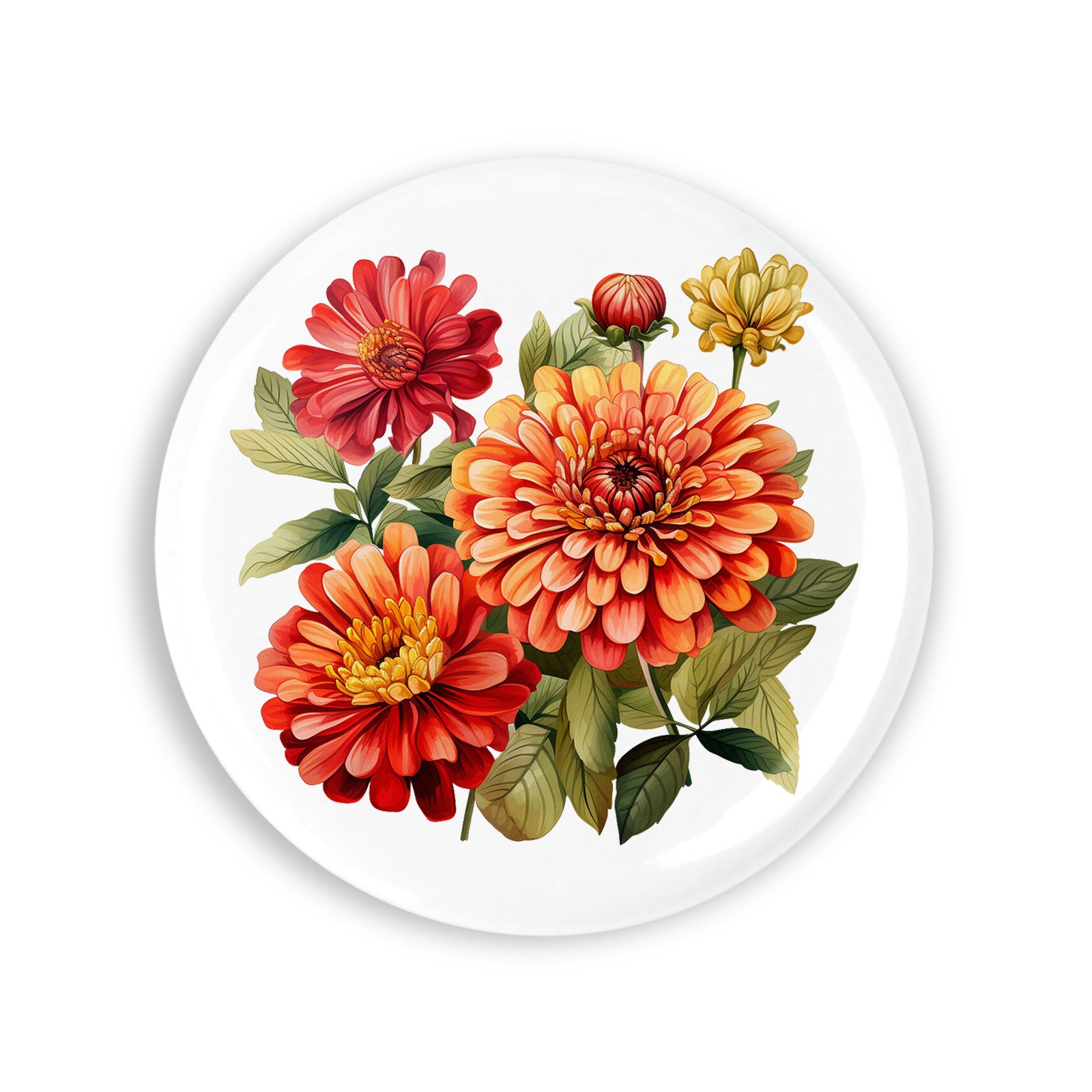 - Set 4 insigne, Buchet de flori zinnia rosu su galben, NO759, Metal, 44 mm, Multicolor