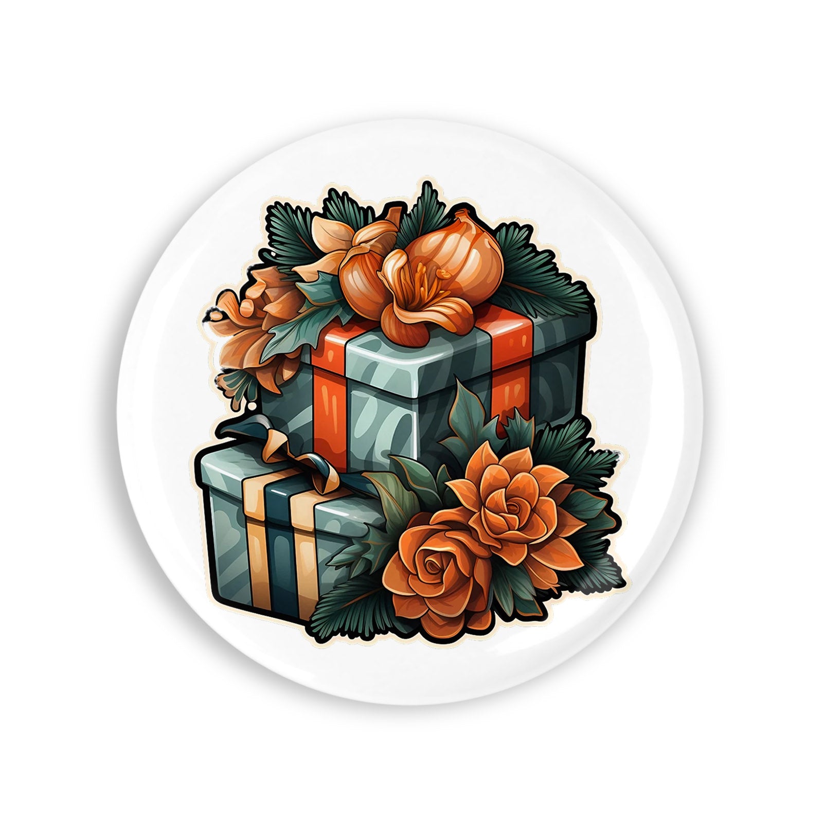 - Set 4 insigne, Cadouri de craciun si flori, NO679, Metal, 44 mm, Multicolor