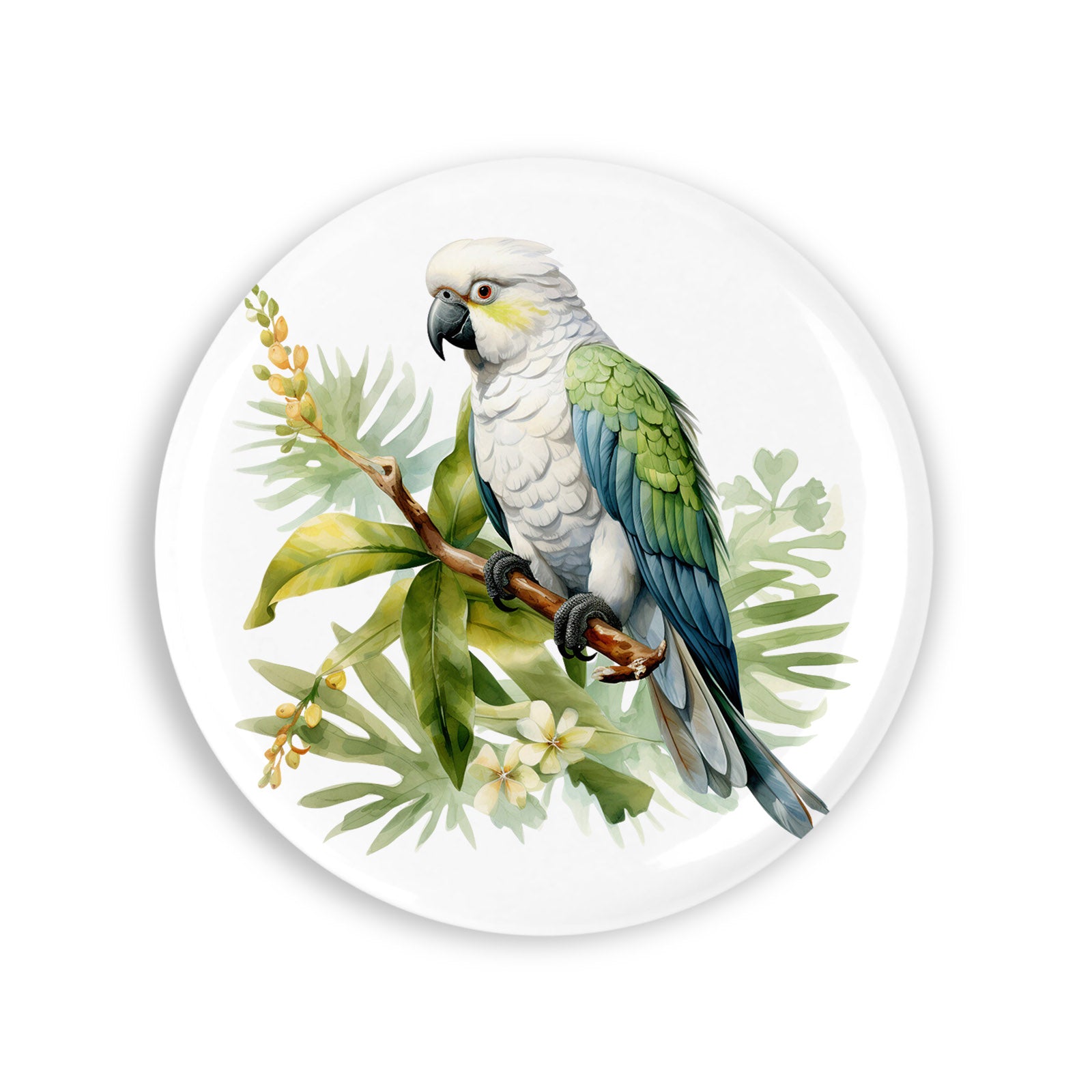 - Set 4 insigne, Papagal alb in eucalipt, NO687, Metal, 44 mm, Multicolor