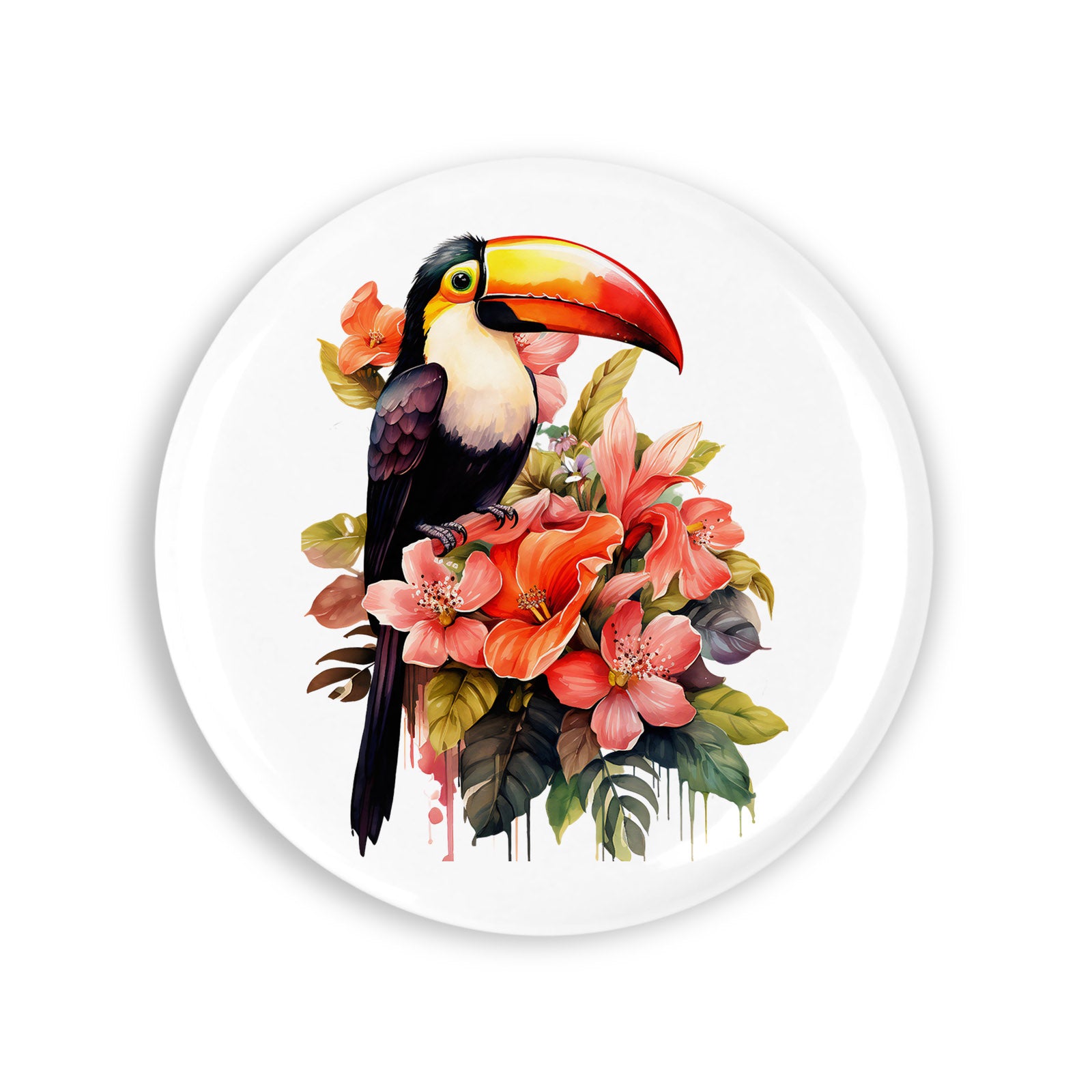 - Set 4 insigne, Papagal Tucan intre flori tropicale, NO4767, Metal, 44 mm, Multicolor