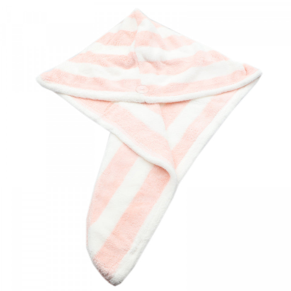 Prosop pentru uscat parul, cu un nasture pentru fixare, pentru adulti, model dungi, 65 x 26 cm, Roz