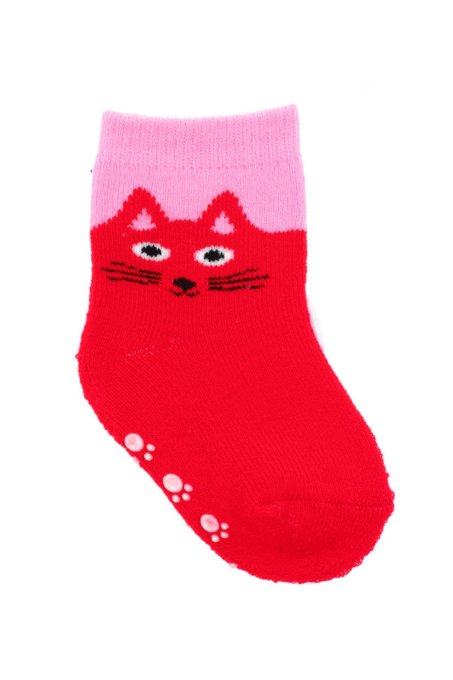 Sosete pentru copii, flausate, antiderapante, 95% Bumbac, imprimeu pisica, 18-24 luni, Rosu