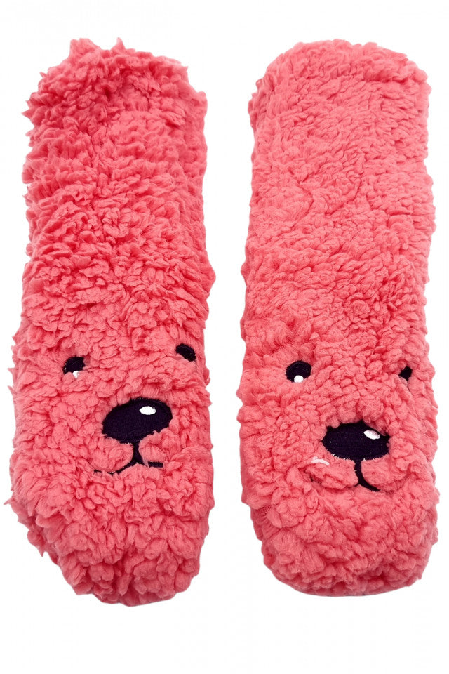 Sosete pentru copii, pufoase, antiderapante, imprimeu ursulet, marime 28-31, Corai