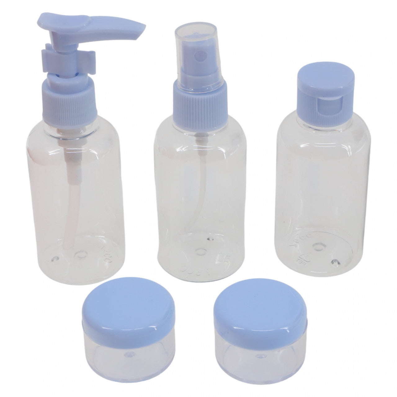 Set 5 bucati, recipiente pentru calatorii cu avionul, din plastic, cu borseta, NO9365, 15-75 ml, Albastru