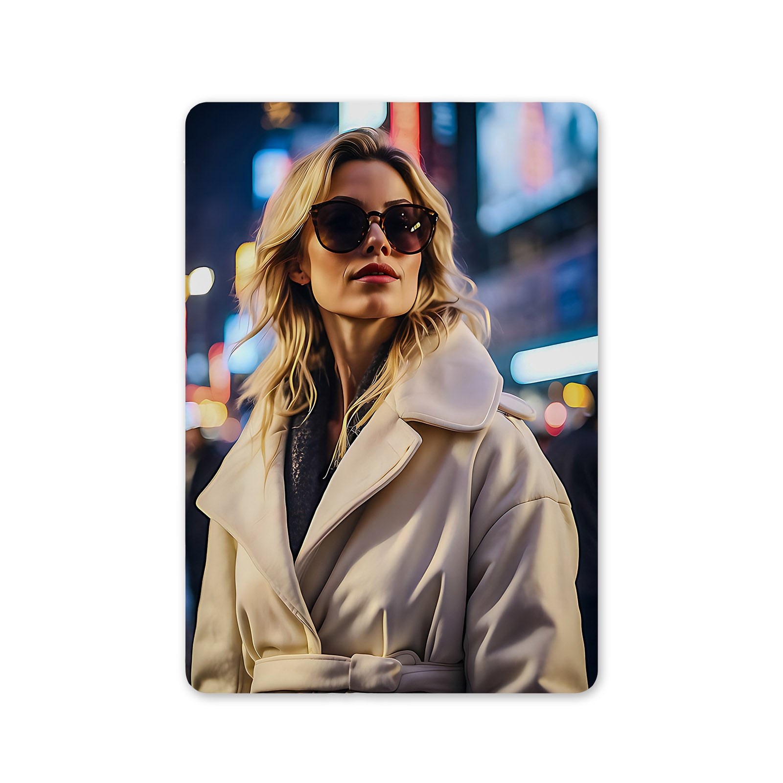 - Tablou din aluminiu, Blonda cu pardesiu alb, NO332, Sidef, 19.5 x 29.5 cm, Multicolor