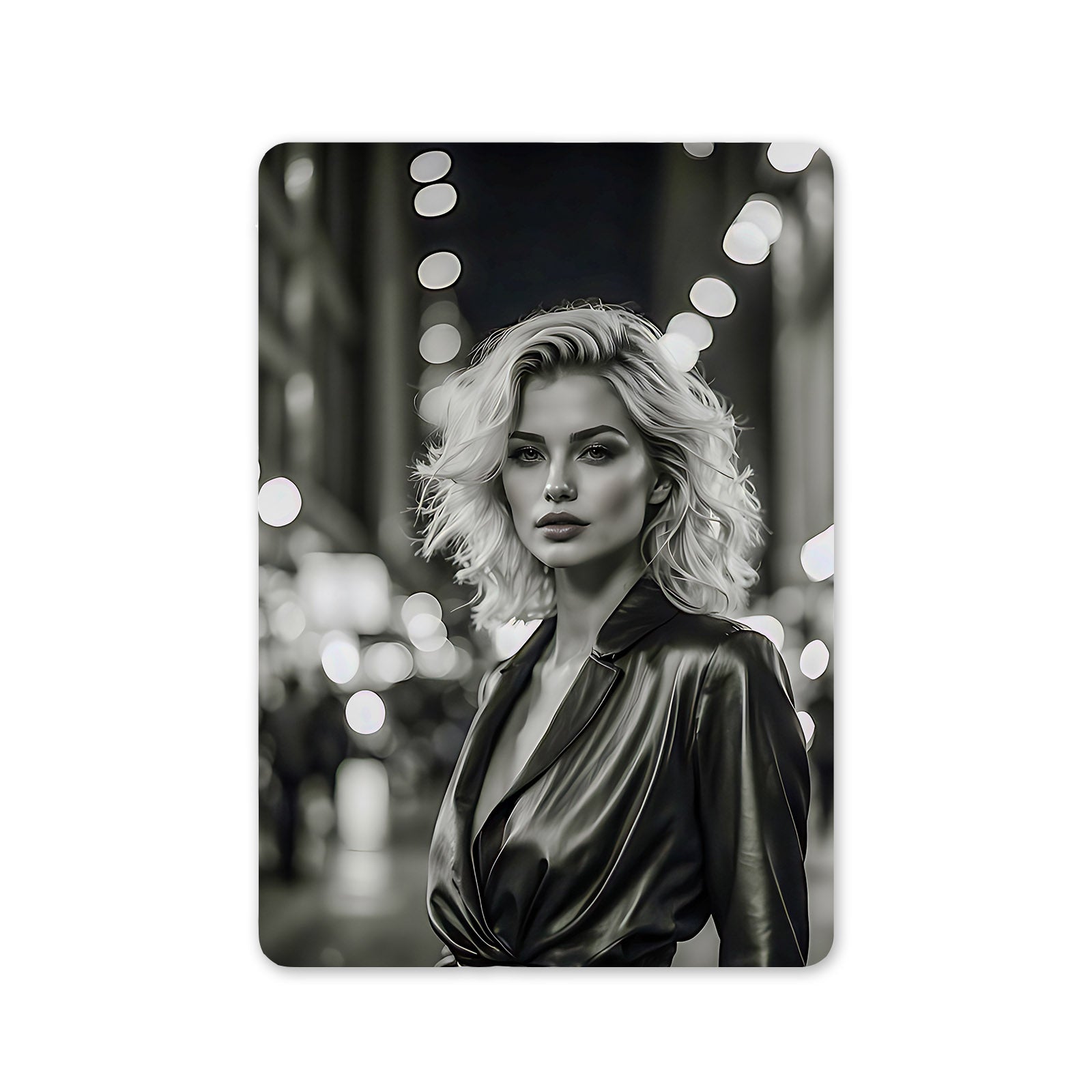 - Tablou din aluminiu, Blonda in rochie neagra, NO684, Sidef, 19.5 x 29.5 cm, Multicolor