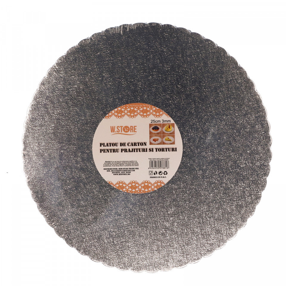 Set 5 bucati, Platou pentru tort sau prajituri, model rotund, din carton 3 mm x 25 cm, Argintiu