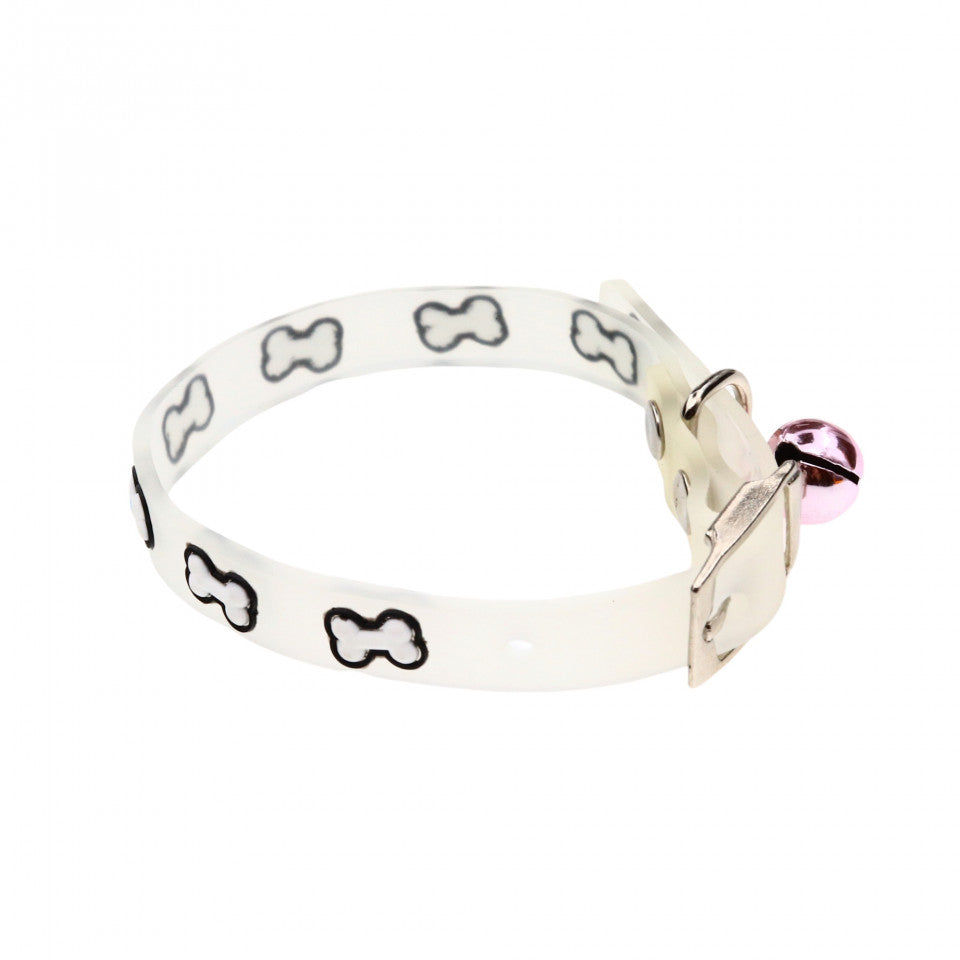 - Zgarda pentru caini sau pisici, din silicon, cu clopotel, imprimeu os, 28 x 1 cm, Alb
