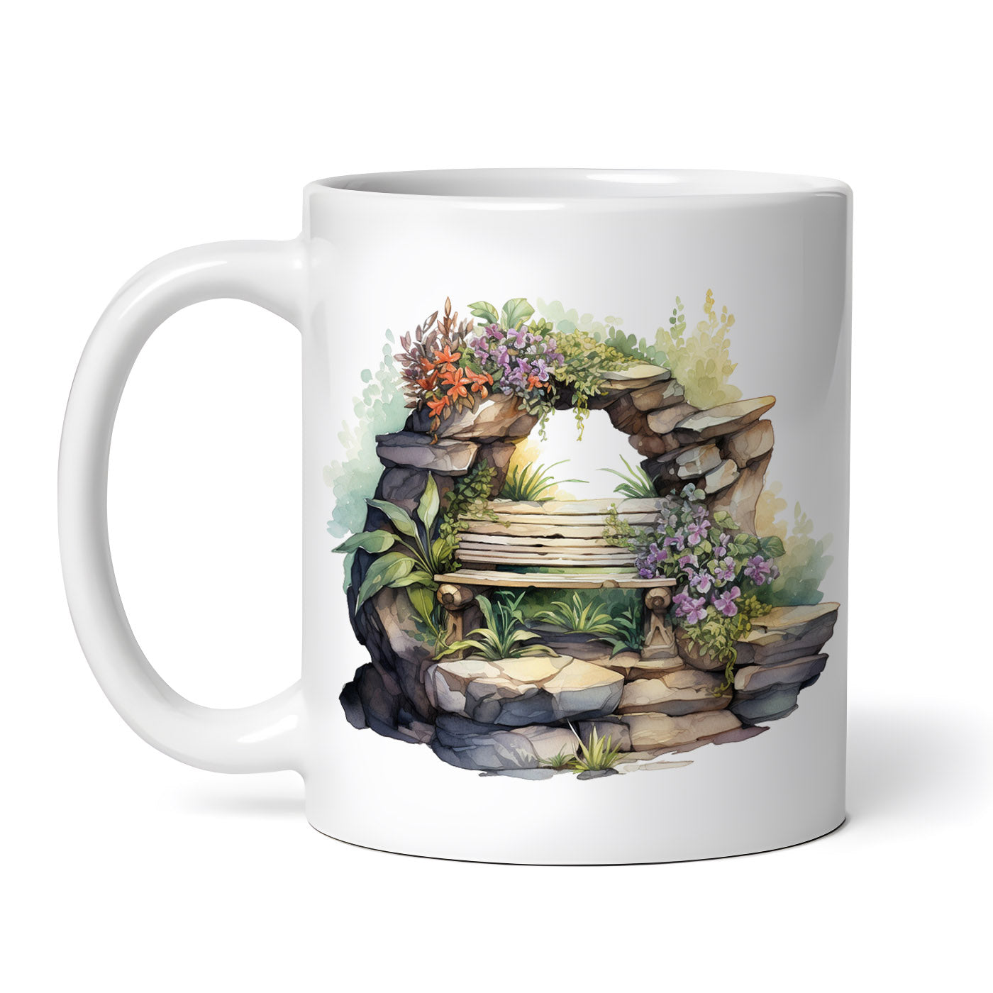 Cana ceramica, Banca de lemn cu flori printre pietre, NO6337, 330 ml, Multicolor