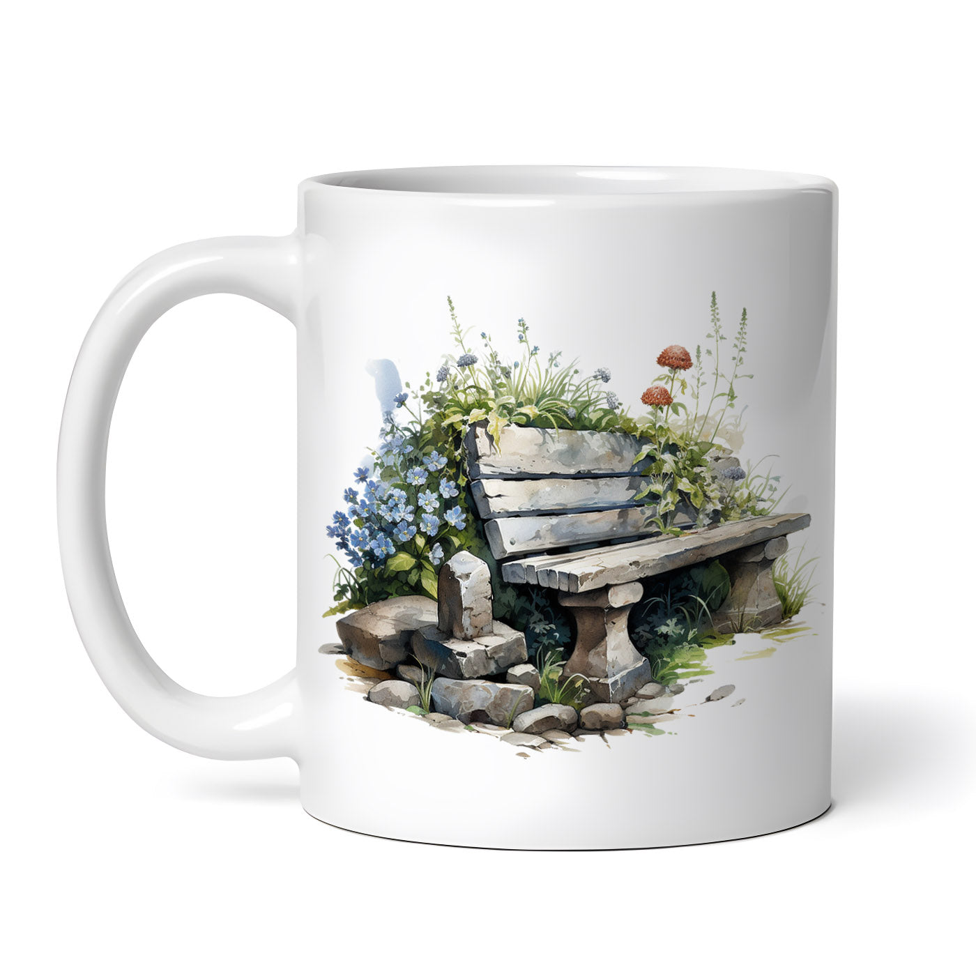 Cana ceramica, Banca de piatra cu flori albastre si rosii, NO1666, 330 ml, Multicolor