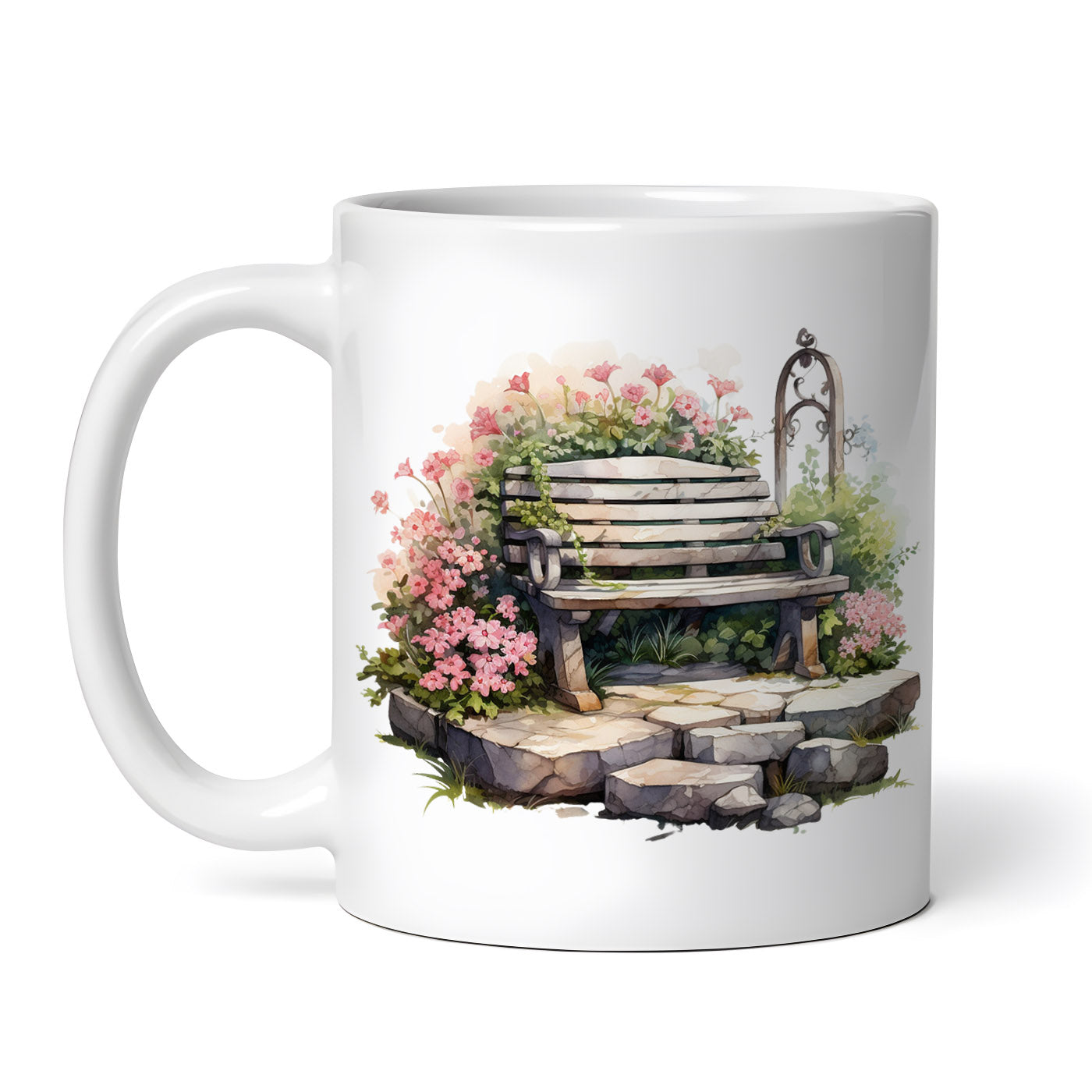 Cana ceramica, Banca din gradina cu flori roz, NO4528, 330 ml, Multicolor