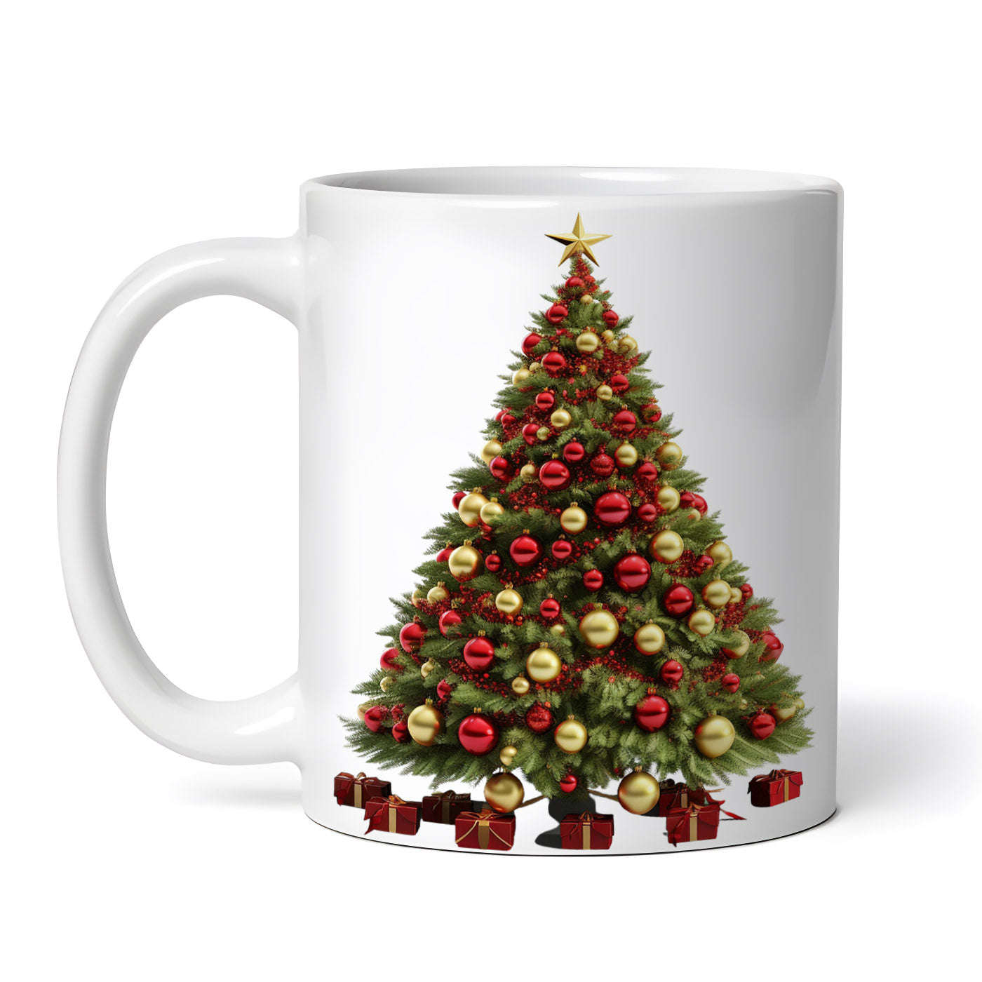 Cana ceramica, Brad de craciun cu globuri auriu si rosu, NO521, 330 ml, Multicolor