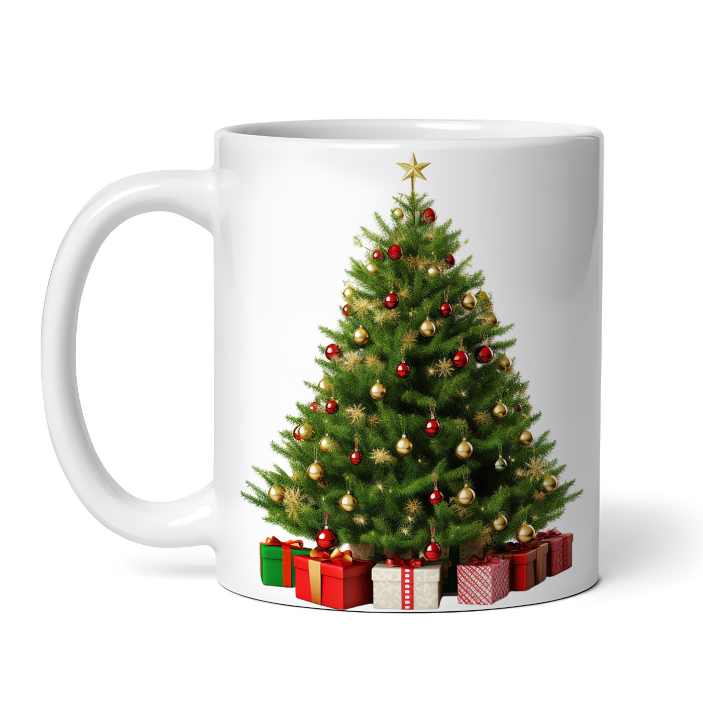Cana ceramica, Brad de craciun cu globuri auriu si rosu si stelute aurii, NO1392, 330 ml, Multicolor