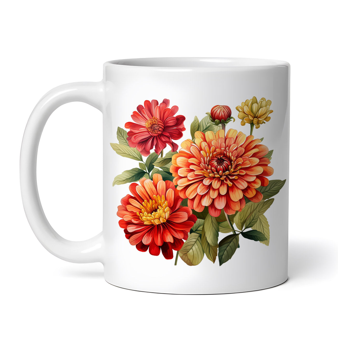 Cana ceramica, Buchet de flori zinnia rosu su galben, NO759, 330 ml, Multicolor