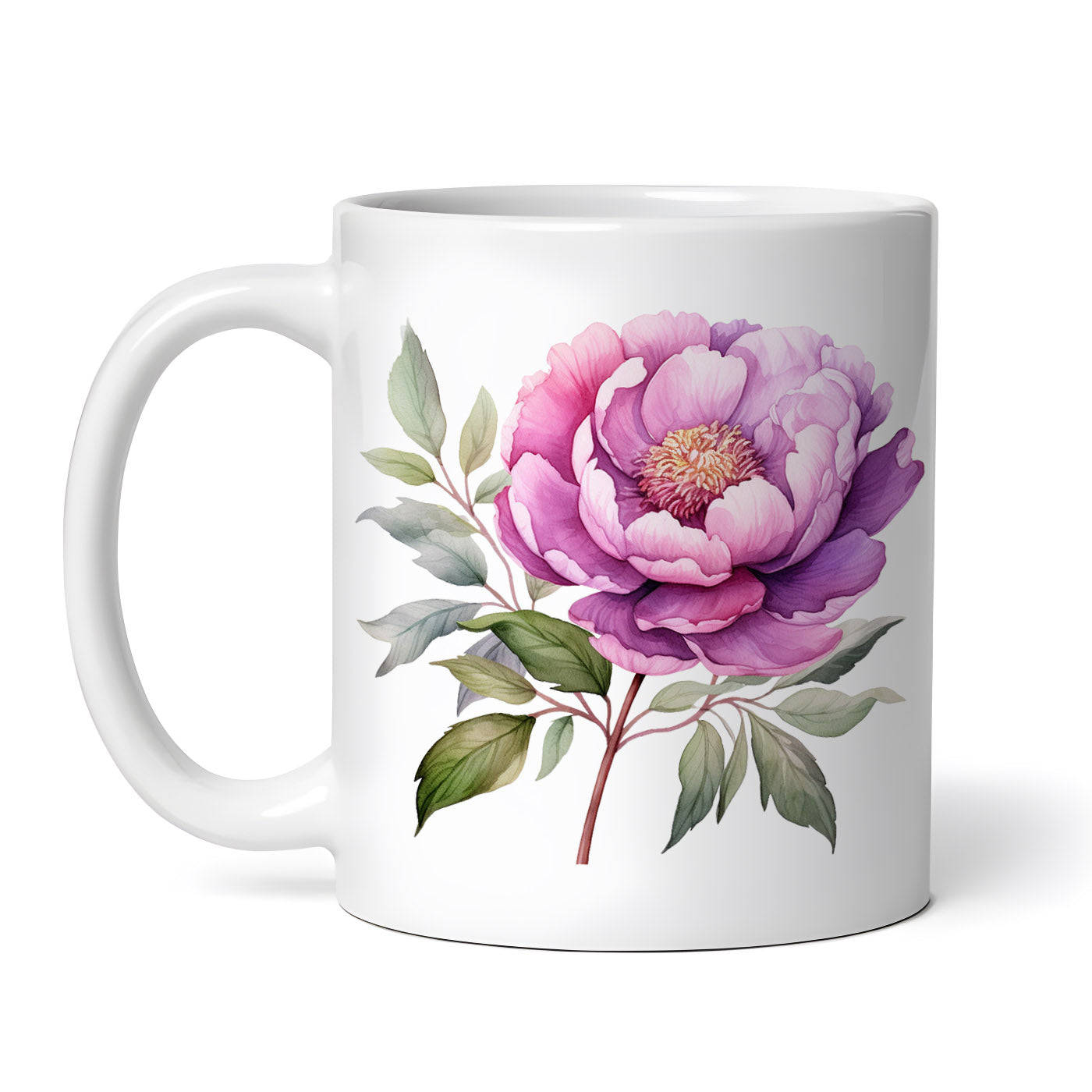 Cana ceramica, Bujor inflorit cu frunze, NO1994, 330 ml, Multicolor