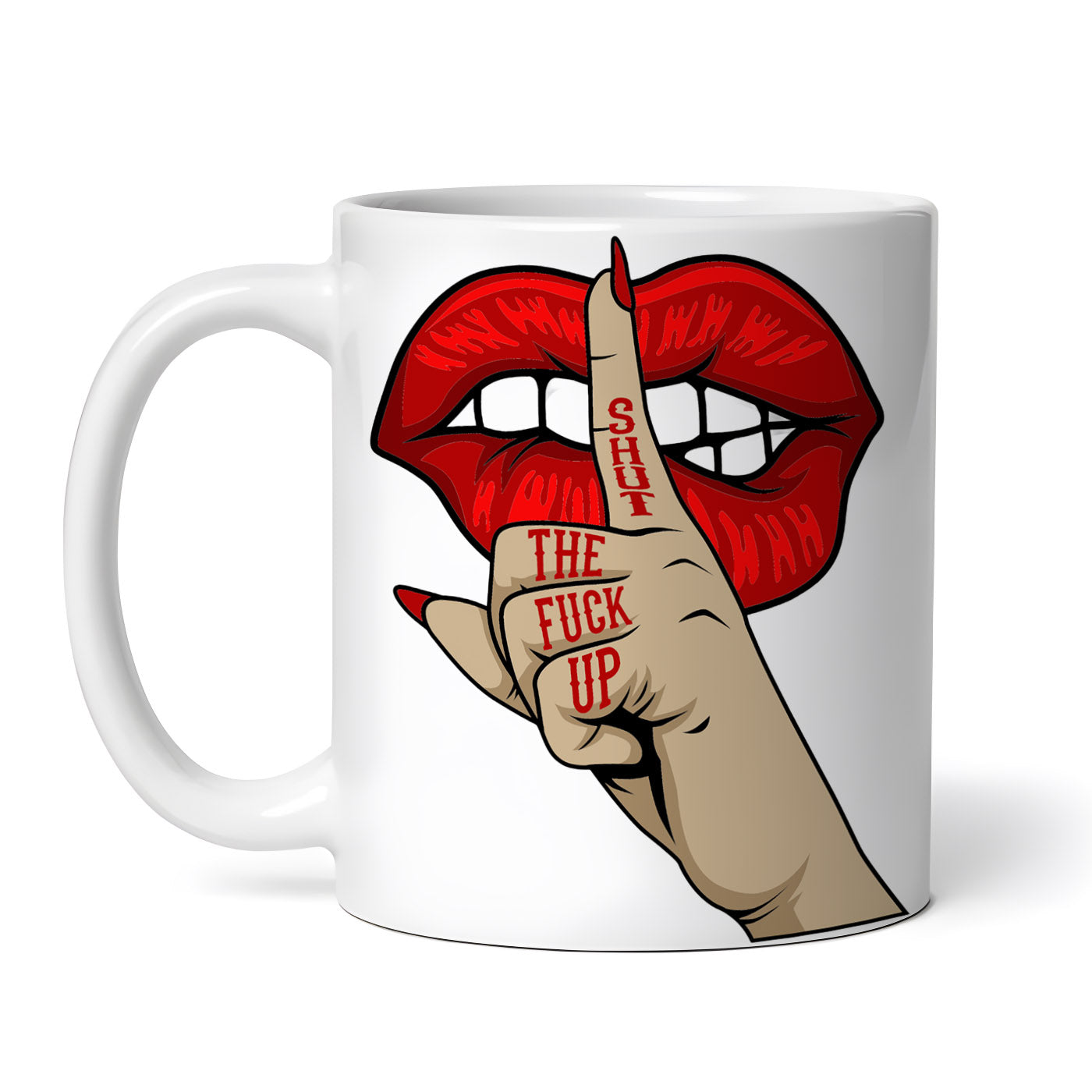 Cana ceramica, Buze rosii Shhh TFU, NO9487, 330 ml, Multicolor
